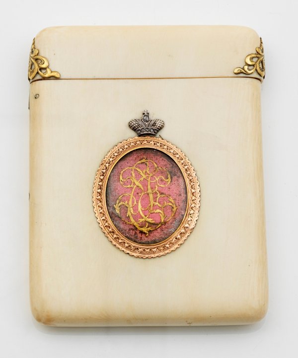 Visitenkarten-Etui Elfenbein mit teilw. vergoldetem Silber. Rechteckig mit gerundeten Seiten. Seitlich scharnierter Deckel mit vergoldeten, ornamentierten Silberapplikationen. Schauseitig verglastes Medaillon mit goldenem Monogramm in Zierschrift auf rosafarbenem, gouillochiertem Grund. Darüber Krone aus Silber mit Diamantrosen besetzt. Fein ziselierte Kupferrahmung. Gest. Kokoschnik 88. 9,5 cm x 7,5 cm.