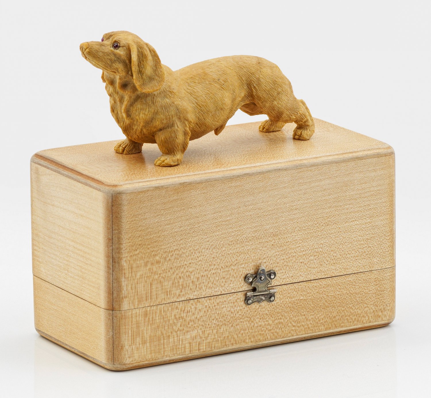 Dackel im Stil von Karl Fabergé. Mit Holzbox. Hellbrauner Jaspis. Vollplastisch geschnittene, naturalistische Darstellung eines stehenden Dackels mit erhobenem Kopf. Als Augen zwei kleine Granatcabochons. L. 11,5 cm.