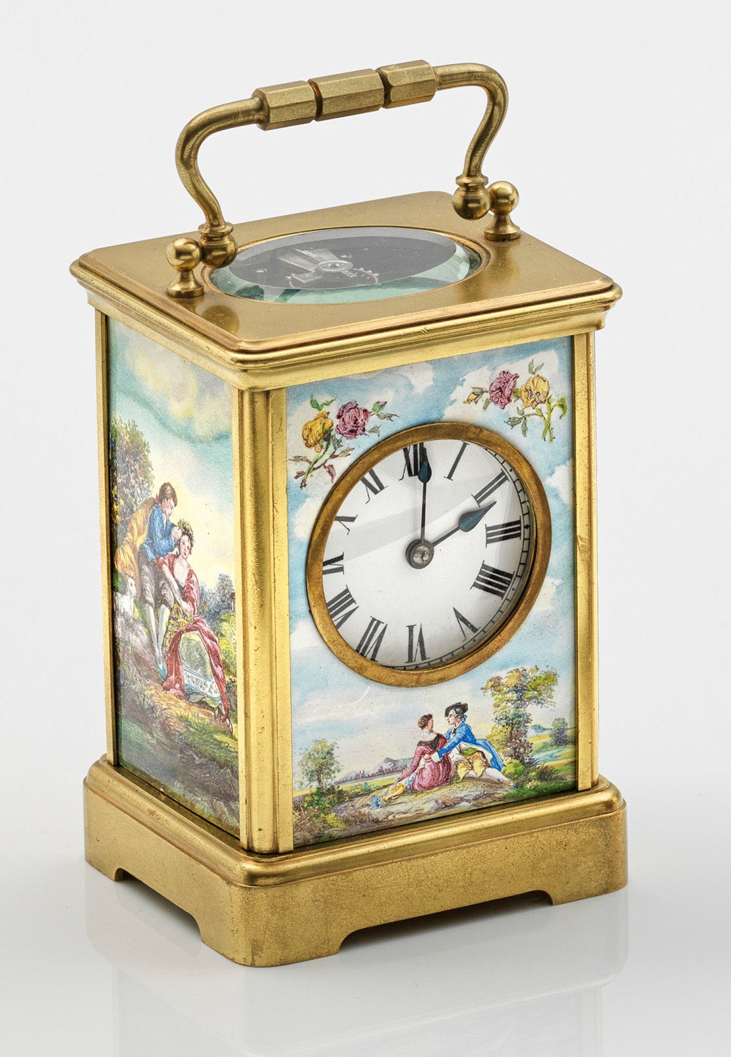 Reiseuhr Messing. Hochrechteckiger Korpus auf Profilsockel. Scharnierter Griff. Allseitig detailreiche Watteauszenen mit Liebespaaren vor weiten baumbestandenen Landschaften. Weißes Zifferblatt mit schwarzen römischen Zahlen. Mechanisches Werk mit Schlüsselaufzug. Werk mit Echappement, Halbstundenschlag auf Tonfeder. Polychrome Emailmalerei. Platine bez. Hands. Ohne Schlüssel, minim. best.; Ges.-H. 16,5 cm.