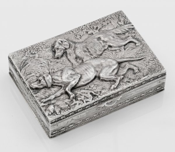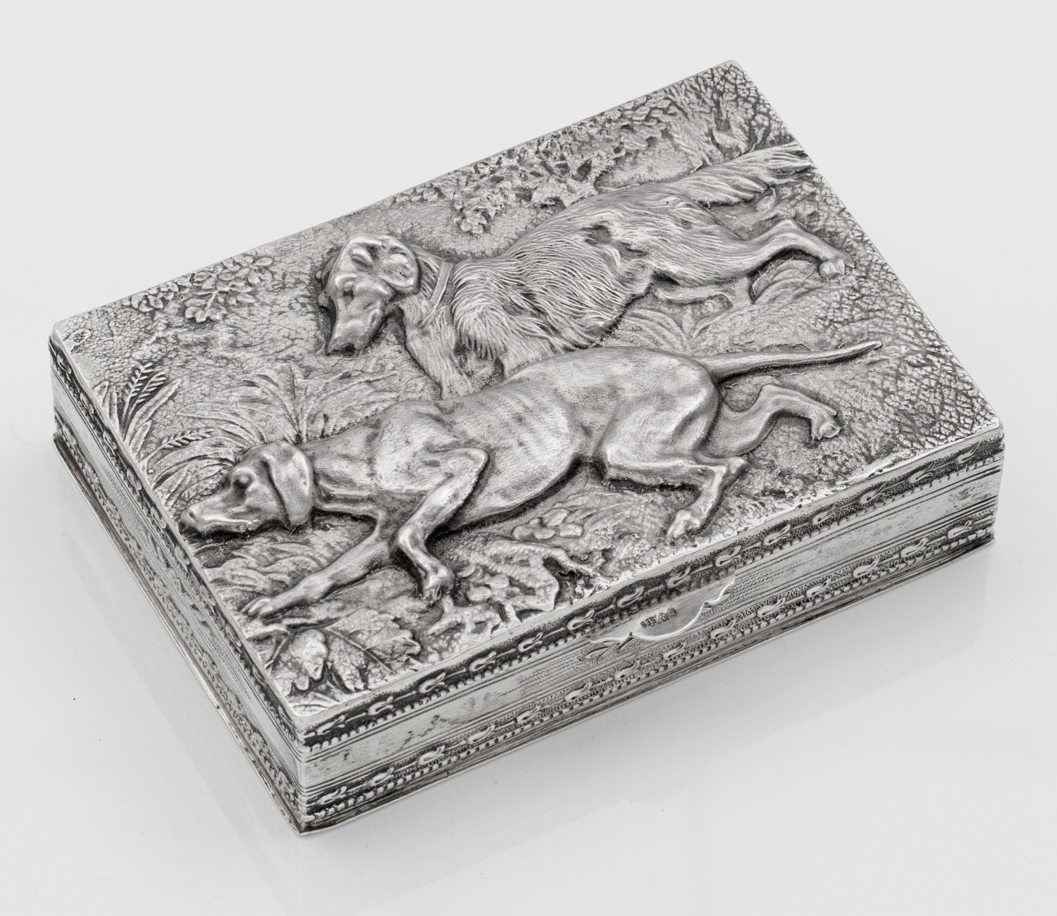 Jagdliche Silberdose Silber. Innen vergoldet. Rechteckig mit schauseitig hochreliefplastischer Darstellung zweier Jagdhunde bei der Pirsch. Wandung mit dekorativem Blütenfries verziert. Scharnierter Deckel. Gew. ca. 360 g. H. 3 cm. 13 cm x 9,5 cm.