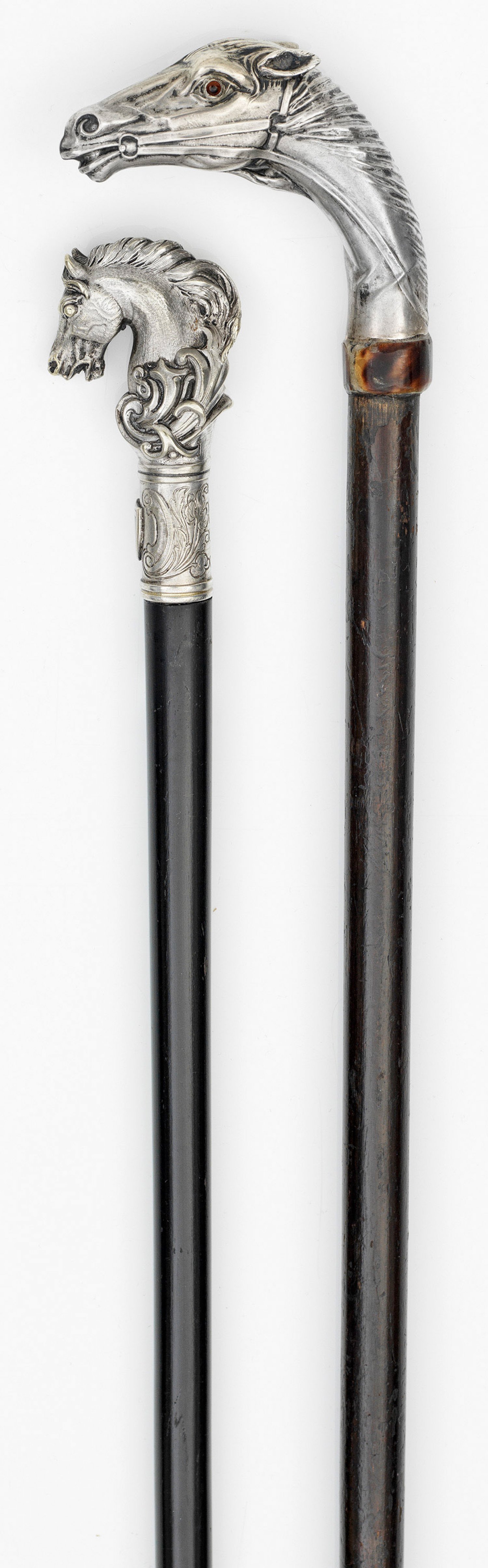Paar Spazierstöcke mit Pferdeköpfen Holz, teilw. ebonisiert, Silber bzw. Messing versilbert. Knäufe mit vollplastischem Abschluss in Gestalt von zwei Pferdeköpfen. Teilw. mit aufgesetzten Glasaugen. Einer mit Monogr. W H.; Teilw. gest. 800. L. 82 cm - 95 cm.