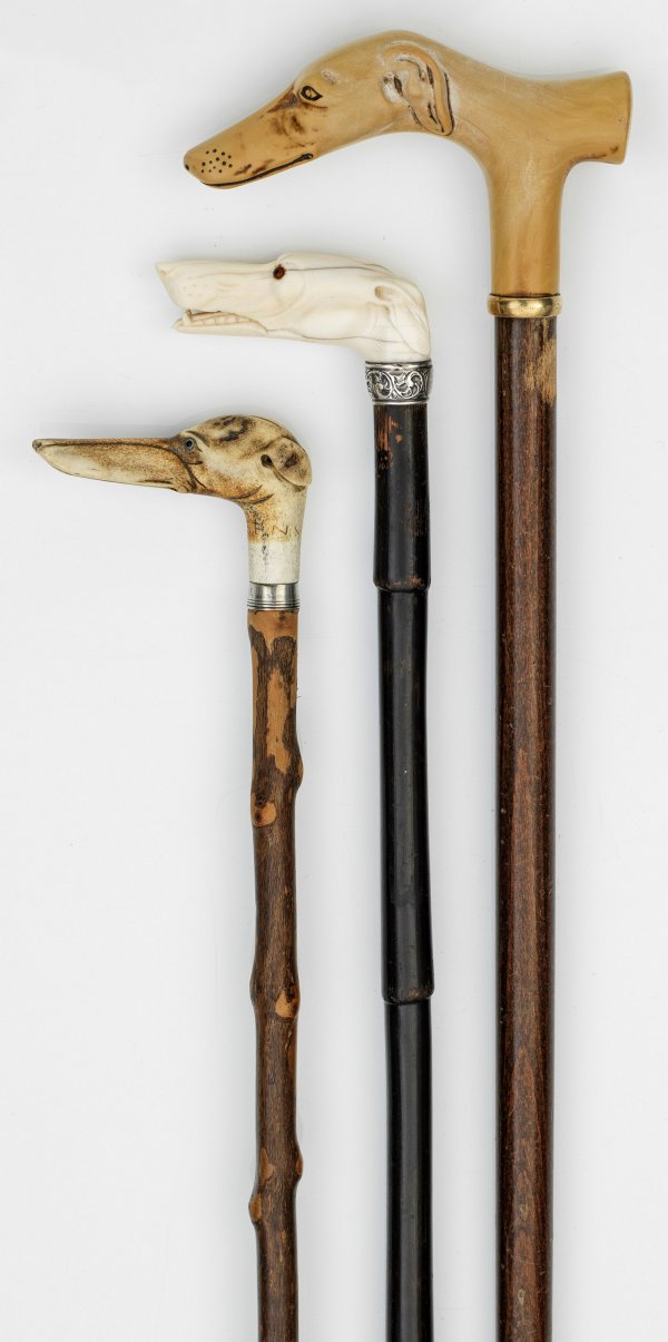 Drei Spazierstöcke mit Windhundköpfen Holz, Bein, Elfenbein, Bakelit. Knäufe mit vollplastischem Abschluss in Gestalt dreier Windhundköpfe. Teilw. mit Glasaugen und floralem Silberband. L. 84,5 cm - 94,5 cm.