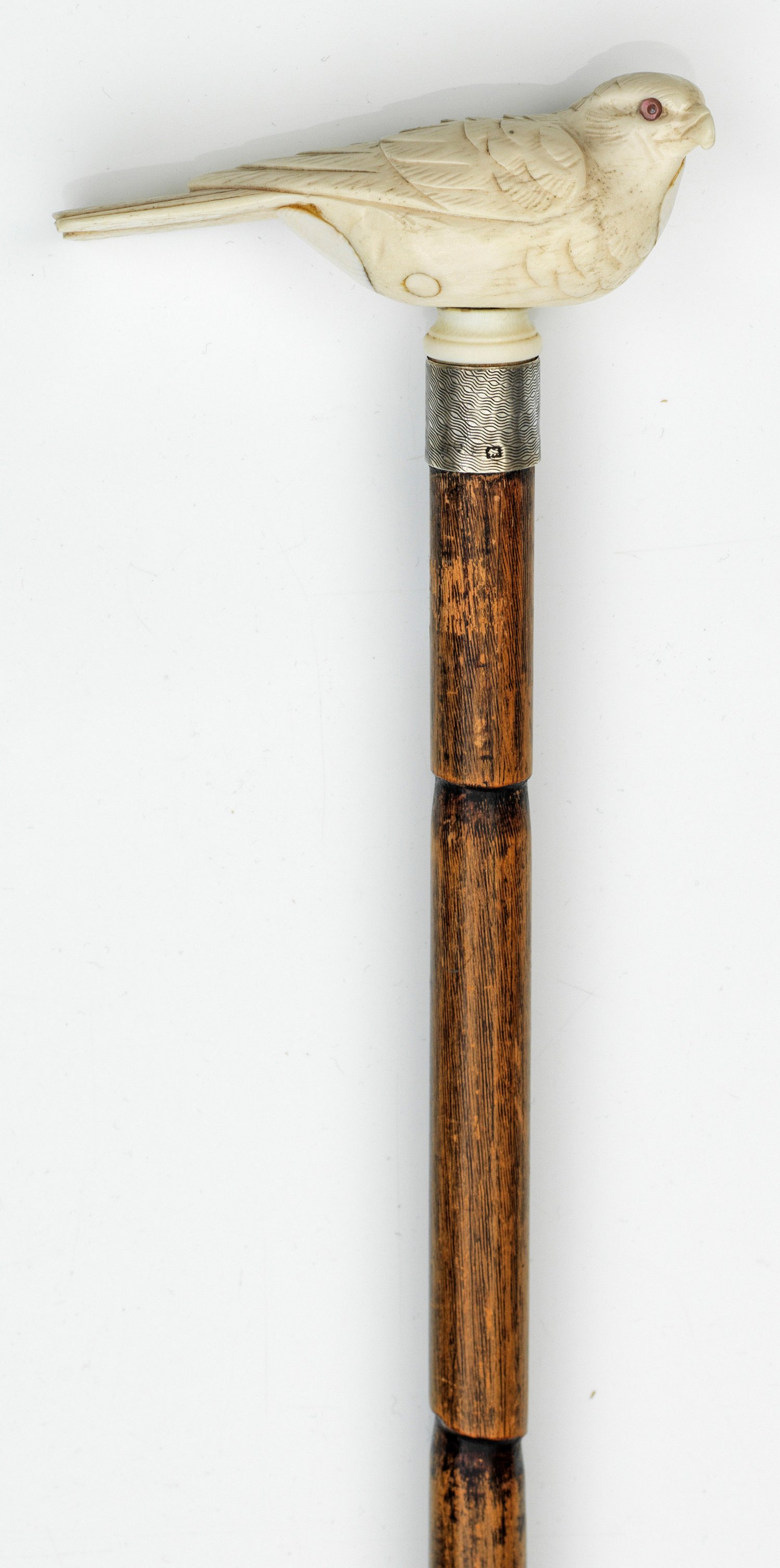 Spazierstock Elfenbein auf Bambusschaft, teilw. Silber. Plastisch gearbeiteter Griff in Gestalt eines sitzenden Falken mit aufgesetzten Perlmutter-Augen. Silberband mit wellenförmigem Dekor. Teilw. rest.; L. 87 cm.