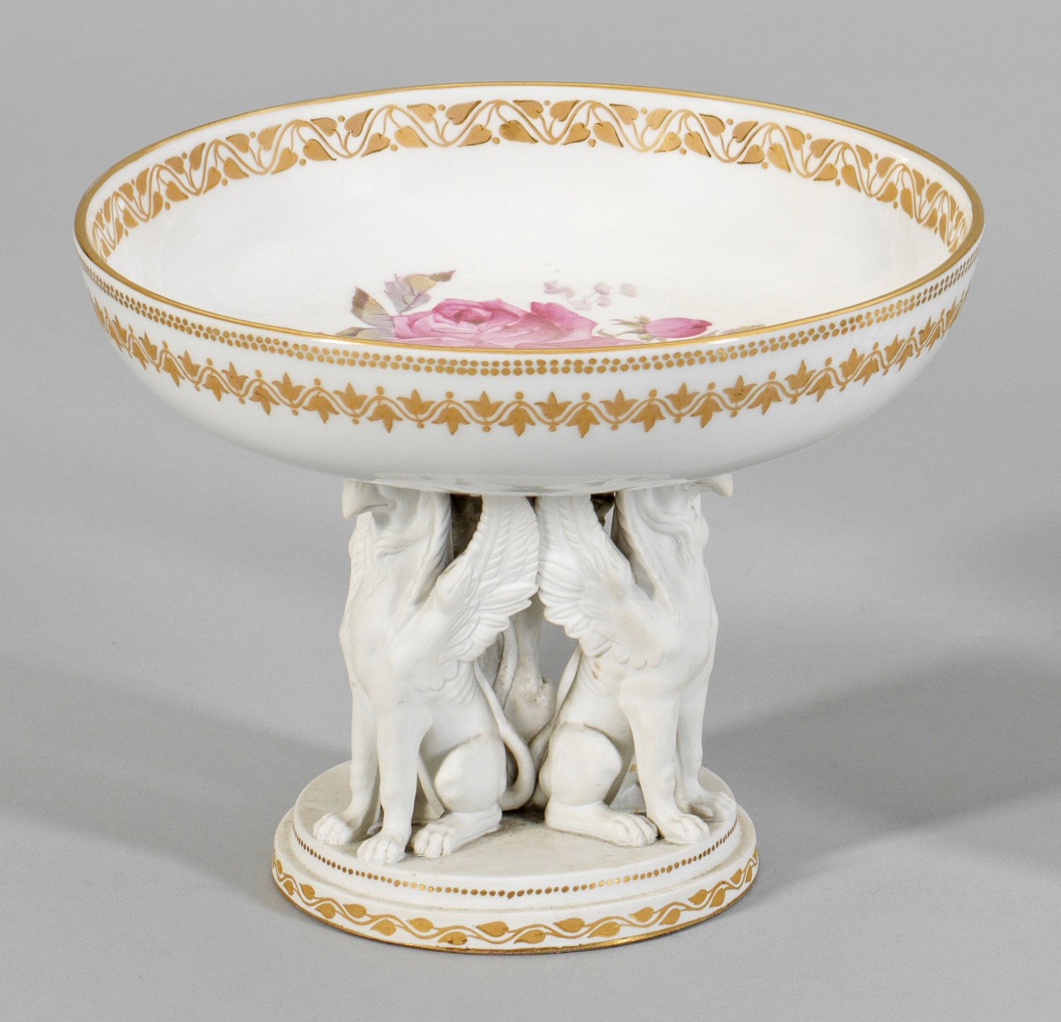 Empirestil-Aufsatzschale mit Rosendekor Über runder Plinthe drei vollplastisch gearbeitete, sphingenähnliche Mischwesen aus Biskuitporzellan als Träger für runde, gemuldete Schale. Im Spiegel naturalistisch gestaltetes Rosenbukett in feiner polychromer Malerei. Umlaufend unterschiedliche, stilisierten Goldornamentbordüren. Jahresbuchstabe. Zepter-, Malerei- und Kriegsmarke. H. 13 cm. D. 17 cm.