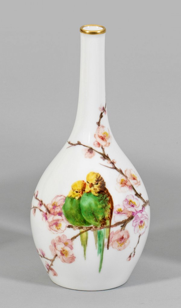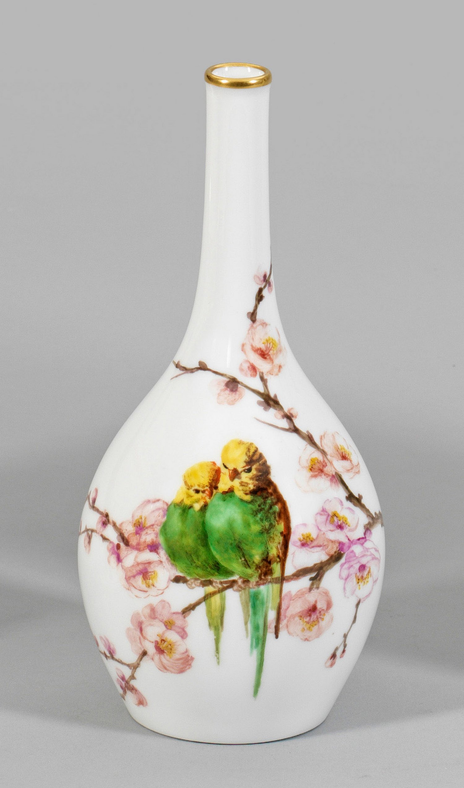 Kleine Enghalsvase mit Wellensittich-Dekor Flaschenförmiger Korpus, in schmalen Hals übergehend. Auf der Wandung großflächig angelegte Darstellung von einem Wellensittichpaar, auf einem Kirschblütenzweig sitzend, umgeben von Schmetterlingen in impressionistisch anmutender Malerei (später). Goldrand. Form-Entw. Theodor Schmuz-Baudiss (1859 - 1942). Im Boden Maler-Monogr. MR. Jahresbuchstabe. Zeptermarke. H. 21 cm.