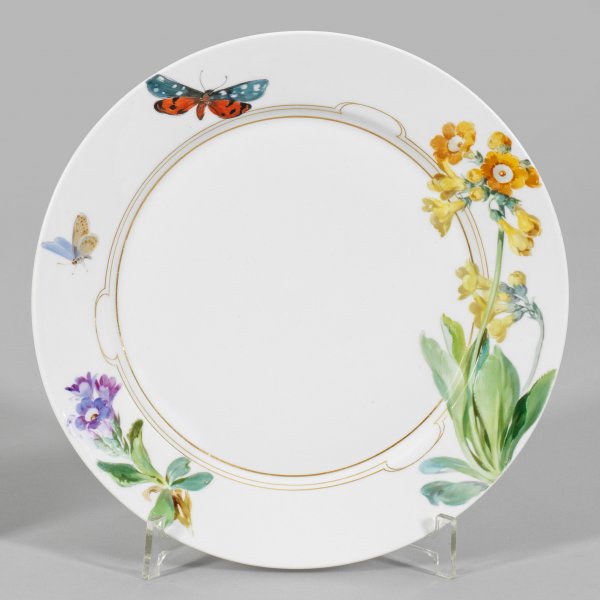 Zierteller mit Blumenmalerei Runde Form mit glattem Rand. Auf der Fahne, übergehend in leicht vertieften Spiegel, zarte gelbe und lilafarbene Glockenblumenzweige sowie farbenprächtige Schmetterlinge in feiner, polychromer, impressionistisch angelegter Malerei. Umlaufender Steigbord mit feinlinigem Golddekor. Schwertermarke. D. 27 cm.
