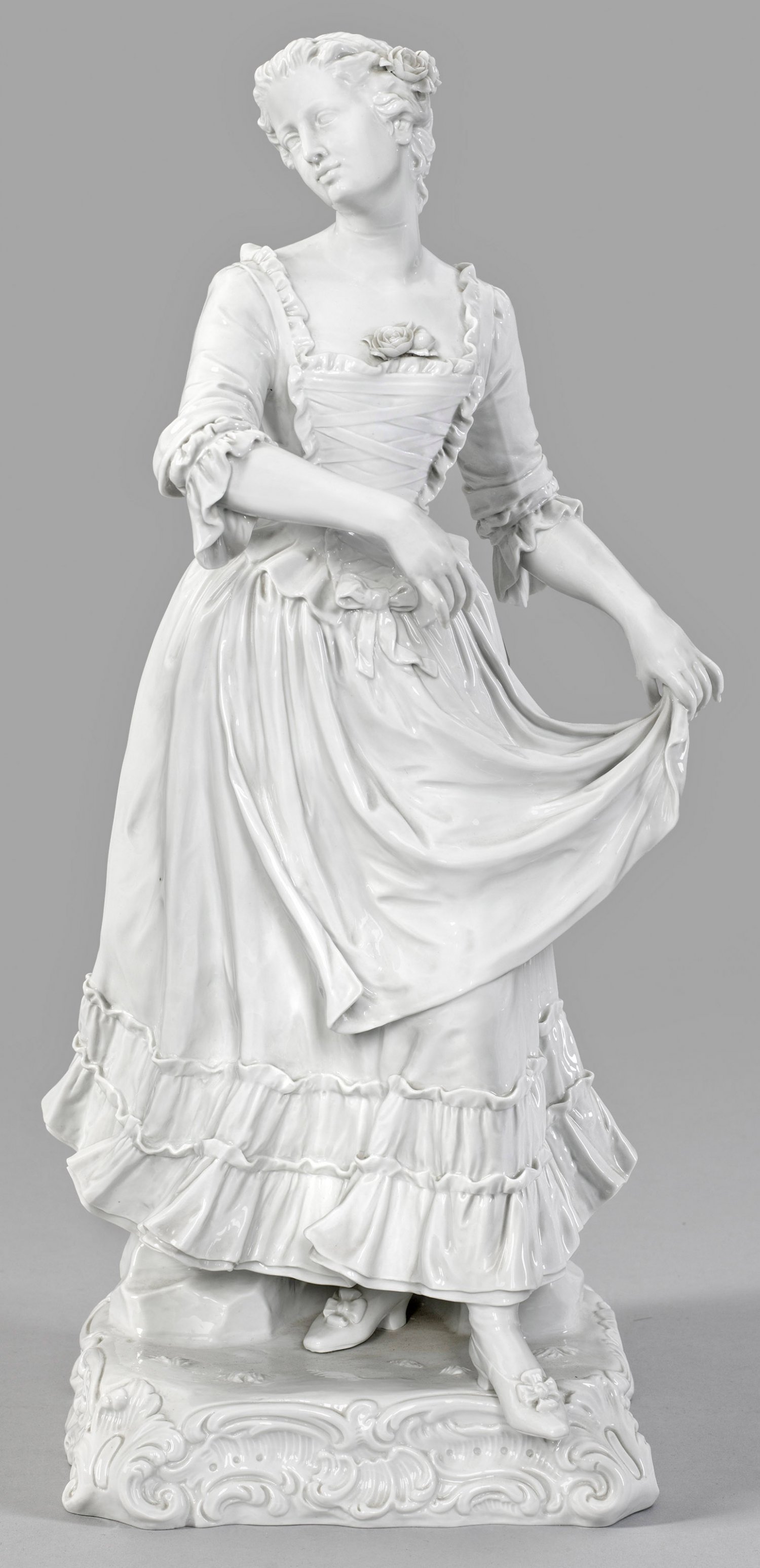 Große Figur einer Tänzerin Weißporzellan. Auf stark reliefiertem, quadratischem Rocaillesockel, in Tanzpose mit vorgestrecktem linken Fuß stehendes Mädchen in sommerlicher Kleidung. Entw. Ernst August Leuteritz, um 1853. Modell-Nr. 73311. Best.; Schwertermarke. H. 46 cm.