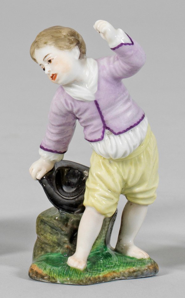 Bauernjunge Auf naturalistisch gestaltetem Sockel stehender Bauernjunge, in der rechten Hand einen Hut haltend. Nach Althöchster Modell. Polychrome Malerei. Manufakturmarke. H. 12 cm.