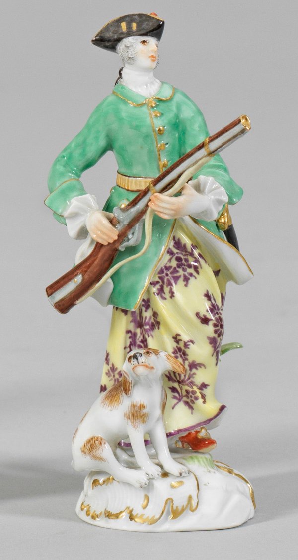 Jägerin mit Hund Auf rocaillereliefiertem Sockel stehende Jägerin in den Händen ein Gewehr haltend. Zu ihren Füßen sitzender, braun gefleckter Hund. Polychrome Malerei mit Goldstaffage. Entw. Friedrich Elias Meyer. Minim. besch.; Schwertermarke. H. 13 cm.