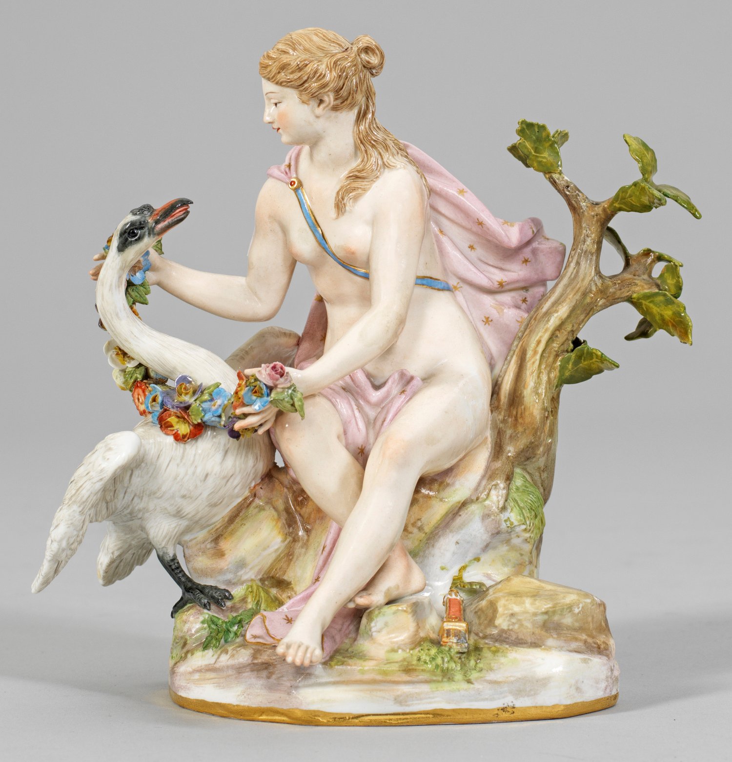 Leda mit dem Schwan Auf einem Felssockel mit Baumstamm sitzende Leda mit rosafarbenem, von Goldsternen gemustertem Tuch, einen seitlich stehenden Schwan mit Blatt- und Blütengirlande schmückend. Zu ihren Füßen liegender Köcher mit Pfeilen. Polychrome Malerei mit Goldkonturierung. Entw. Friedrich Elias Meyer. Minim. best.; Rest.; Schwertermarke. H. 17 cm.