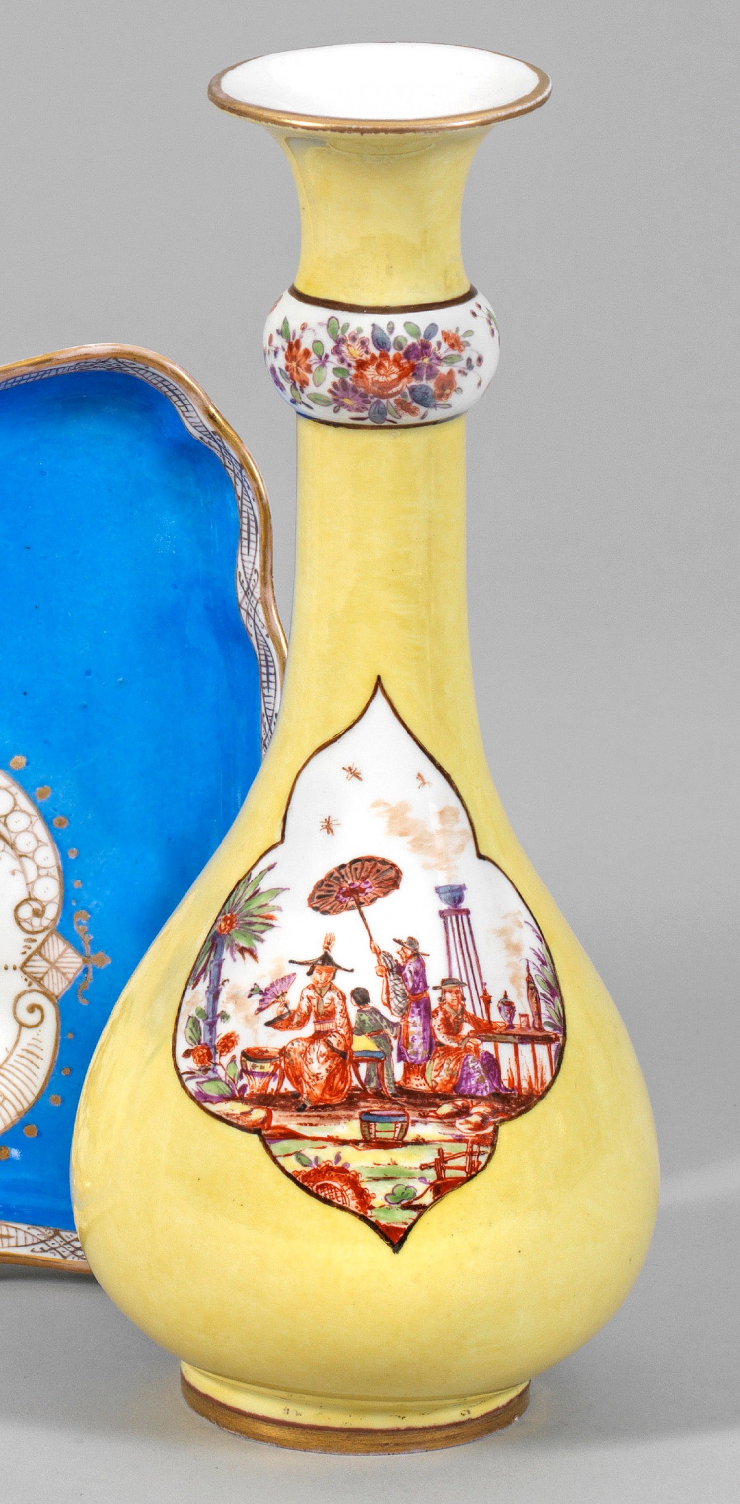 Flaschenvase mit Gelbfond und Chinoiserien Kugelförmiger Korpus, in schlanken Hals mit Nodus übergehend. Beidseitig der Wandung, in zitronengelbem Fond, vierpassig ausgesparte Reserve mit szenischer Darstellung von Chinesen in blühender Gartenlandschaft, sog. Chinoiserien in der Art von J. G. Hoeroldt. Nodus mit Indianischem Blumendekor auf weißem Fond. Leuchtend polychrome Malerei (später). Maler-Sign. F. Unw. rest.; Minim. ber.; Schwertermarke. H. 28 cm.