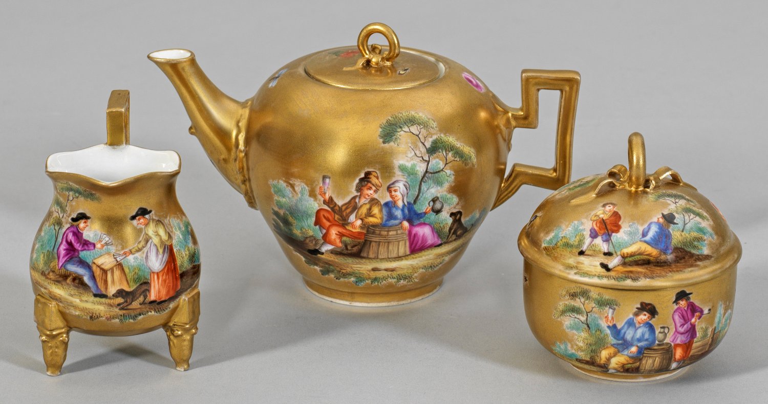 Goldfond-Teekern mit Teniers-Szenen 3-tlg.; Teekanne, Zuckerdose, Sahnegießer. Auf der Wandung bäuerliche, sog. Teniers-Szenen, umgeben von gestreuten Blumen und Insekten in polychromer Malerei auf goldenem Fond. Unw. rest.; Schwertermarke. H. 8,5 cm - 11 cm.