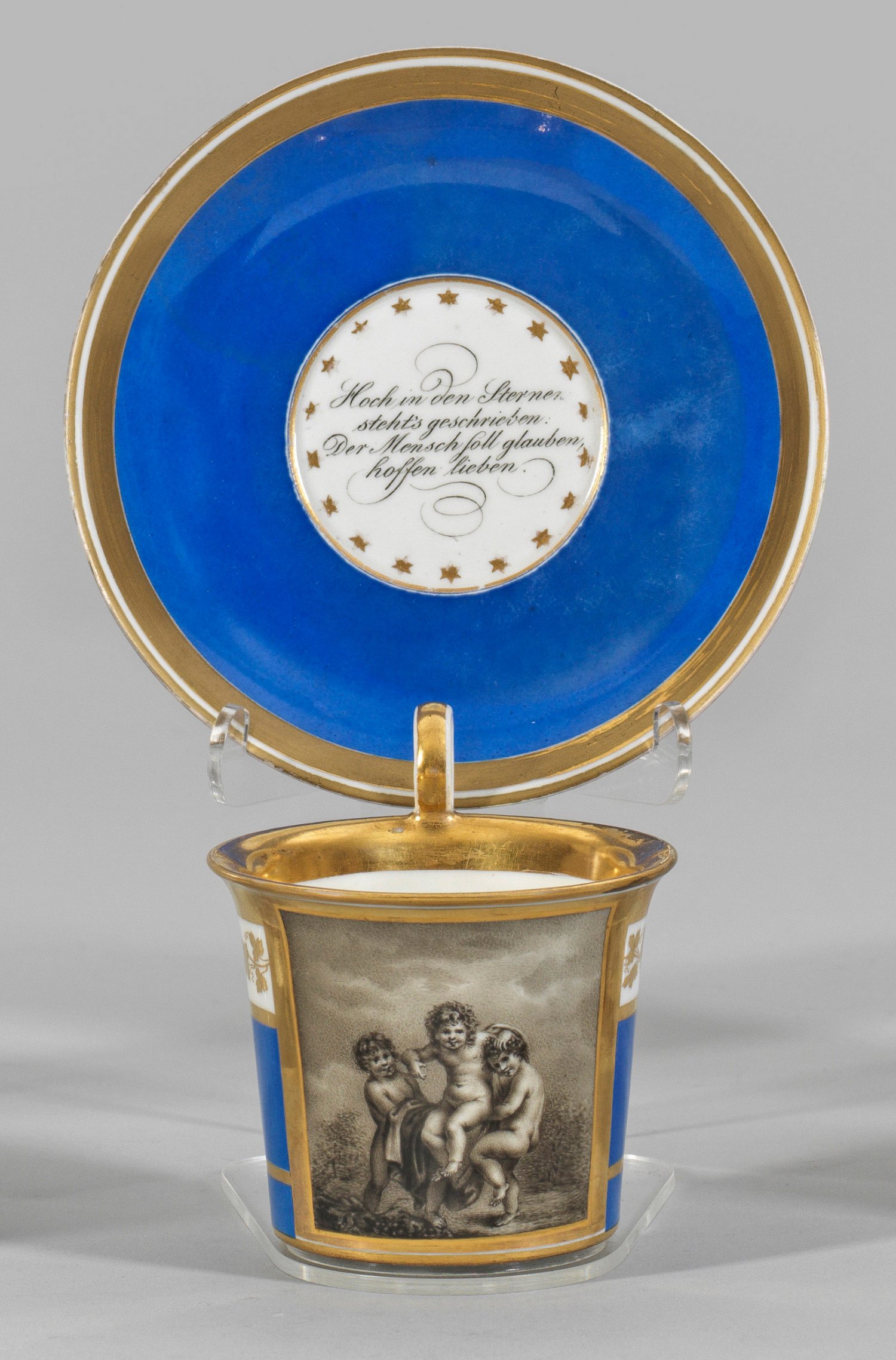 Biedermeier-Ziertasse mit Untertasse. Sich konisch erweiternde Form mit hochgezogenem Volutenhenkel. Königsblauer Fond. Schauseitig goldgerahmte Darstellung von drei Putten in Schwarzlotmalerei. Umlaufende Weinlaubbordüre in Gold. Im Spiegel sternengerahmter Sinnspruch. Dat. (1)826 und (1)828. Untertasse rest.; Manufakturmarke. H. 9 cm.