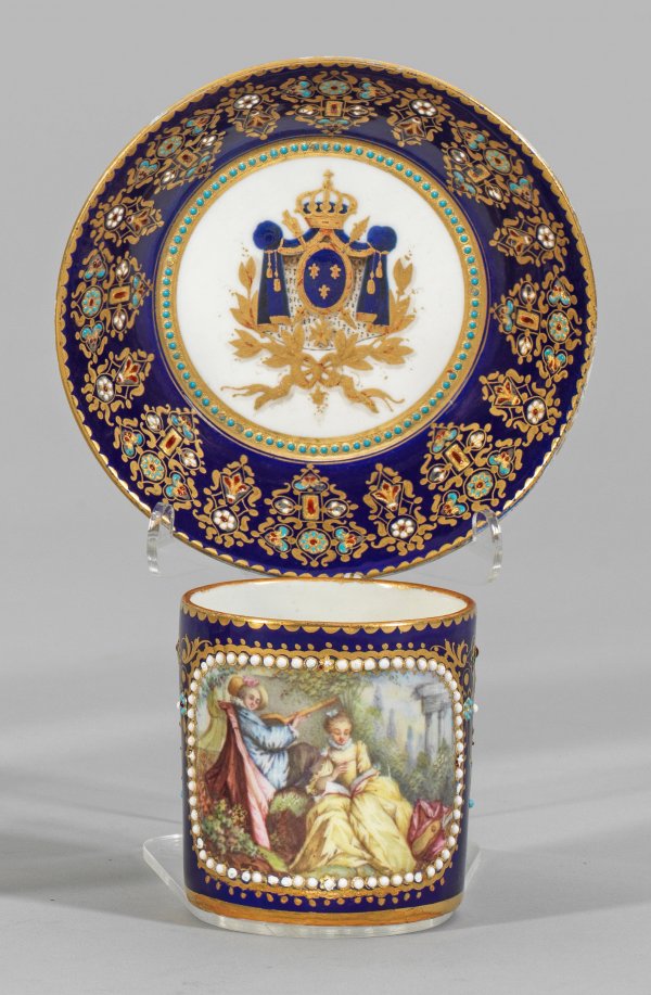 Juwelenporzellan-Tasse mit Untertasse. Zylindrische Form mit gekantetem Ohrenhenkel. Kobaltblauer Fond mit reichem, teilw. radiertem Golddekor und erhabenen Schmelzperlen in Rot, Blau und Weiß, sog. Juwelenporzellan. Schauseitige, perlfriesgerahmte galante Watteauszene in polychromer Malerei. Im Spiegel bekröntes Wappen. Teilw. rest.; Manufakturmarke. H. 7,5 cm.