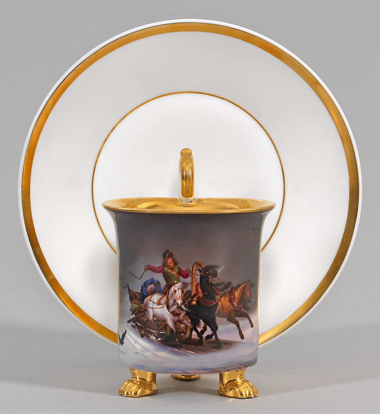 Große Ziertasse mit Troika-Motiv und Untertasse. Walzenform auf Löwenfüßen mit hochgezogenem Rosettenhenkel. Schauseitige Darstellung einer Troika nach einem Gemälde von Pyotr Petrovich Sokolov (1821-1899). Feine polychrome Malerei mit reicher Vergoldung. Abweichende Untertasse von KPM-Berlin, 20. Jh.; H. 12,5 cm.