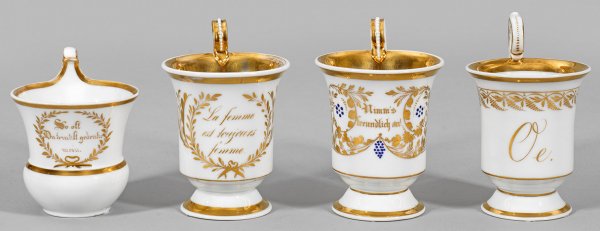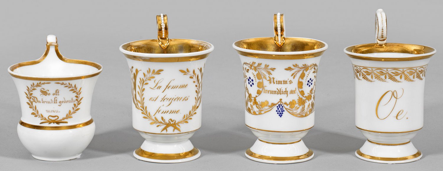 Vier Biedermeier-Andenkentassen mit Golddekor Glockenförmig mit hochgezogenem Blatt- bzw. Volutenhenkel. Schauseitig ein von stilisierten Blattranken und -kranz gerahmter Sinnspruch bzw. Initiale. Golddekor und -staffage. Zepter- und teilw. Malereimarke. H. 10 cm - 12 cm.