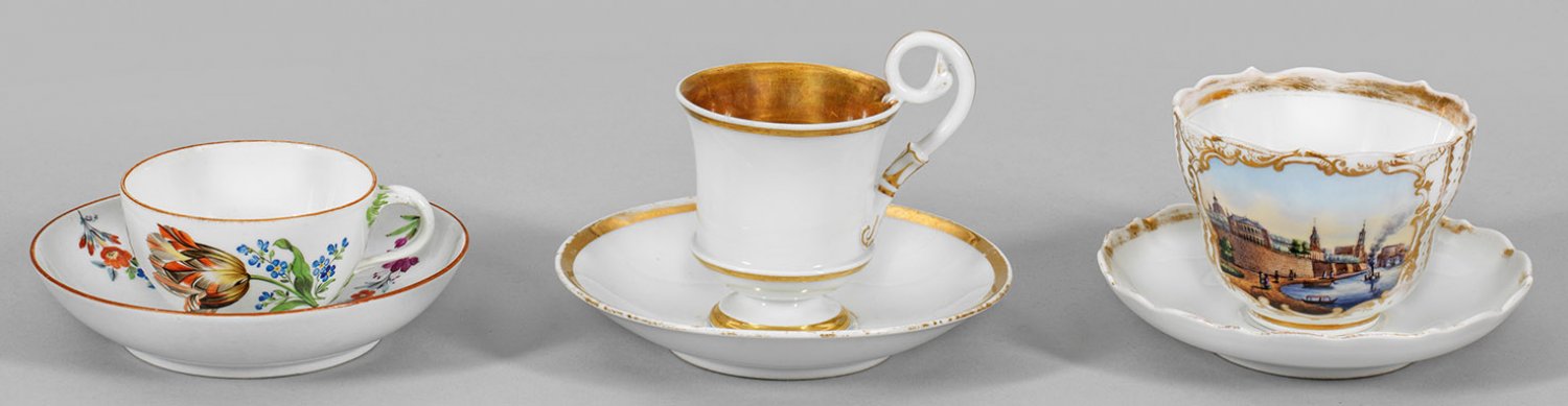 Drei Ziertassen mit Untertassen. Teilw. mit Blumendekor und Stadtansicht. Polychrome Malerei. Teilw. Goldstaffage. Schwertermarke. H. 4 cm - 9,5 cm.