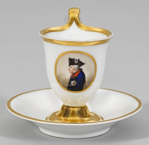 Porträttasse "Friedrich der Große" auf Untertasse. Glockenförmiger Korpus mit hochgezogenem Bandhenkel. Schauseitig goldkonturierte Reserve mit Porträt von Friedrich II. in polychromer Malerei. Goldstaffage. Im Spiegel bez.; Zeptermarke. H. 10,5 cm.