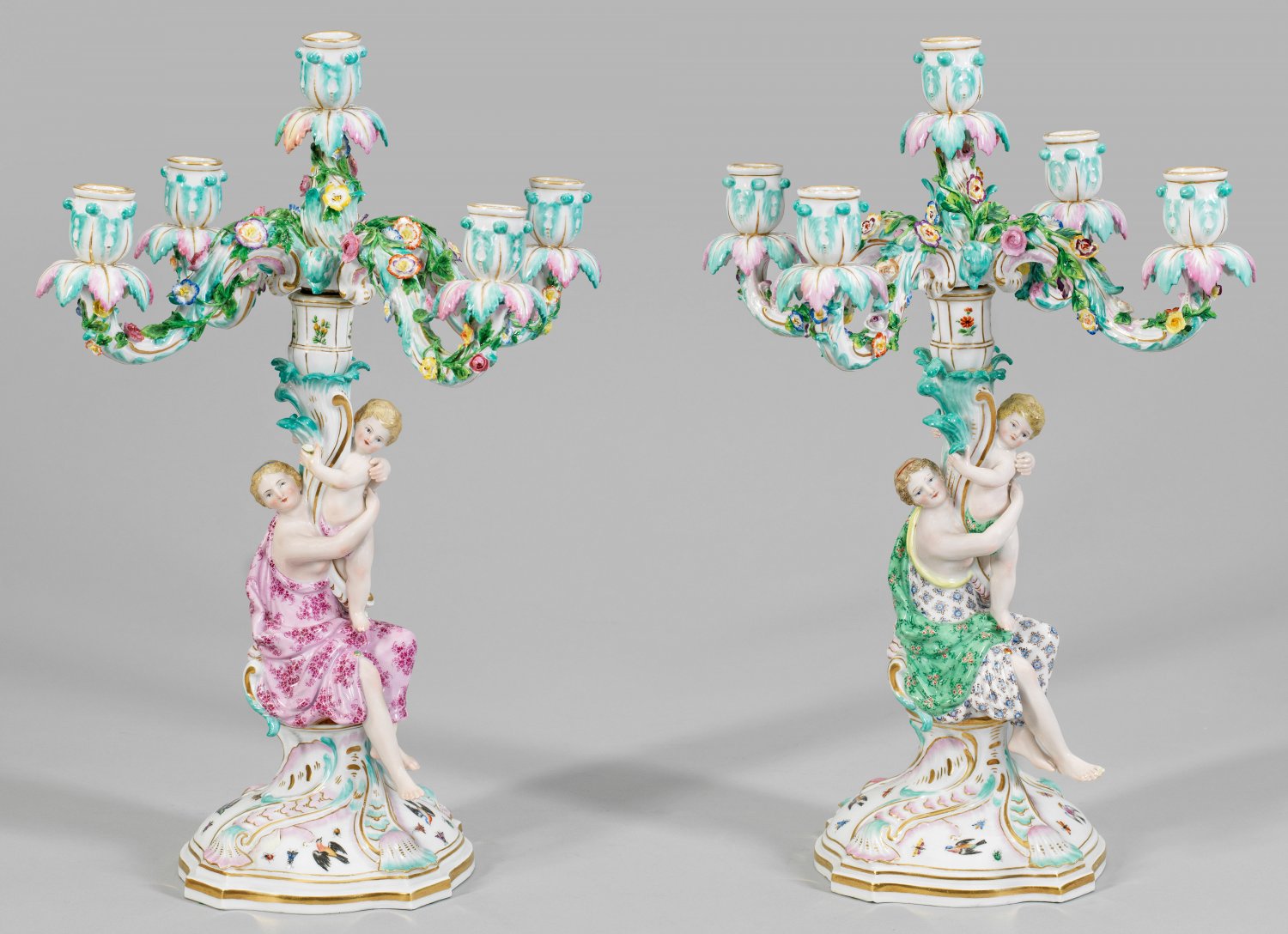 Paar figürliche Girandolen 1-bzw. 5-flg.; Auf geschweiftem, aufgewölbtem, rocailleförmig aufsteigendem Sockel sitzende Dame in blumig gemustertem Gewand, einen Putto umarmend. Davon ausgehender blattförmiger Schaft mit vasenförmiger Tülle. Abnehmbarer Leuchteraufsatz mit geschwungenen, von plastischen Blütenranken umzogenen Leuchterarmen mit blattreliefierter Tülle über Traufschale. Feiner Dekor aus Vögeln, Insekten und Streublumen. Polychrome Malerei mit Goldstaffage. Unw. best./rest.; Schwertermarke. H. 45,5 cm.