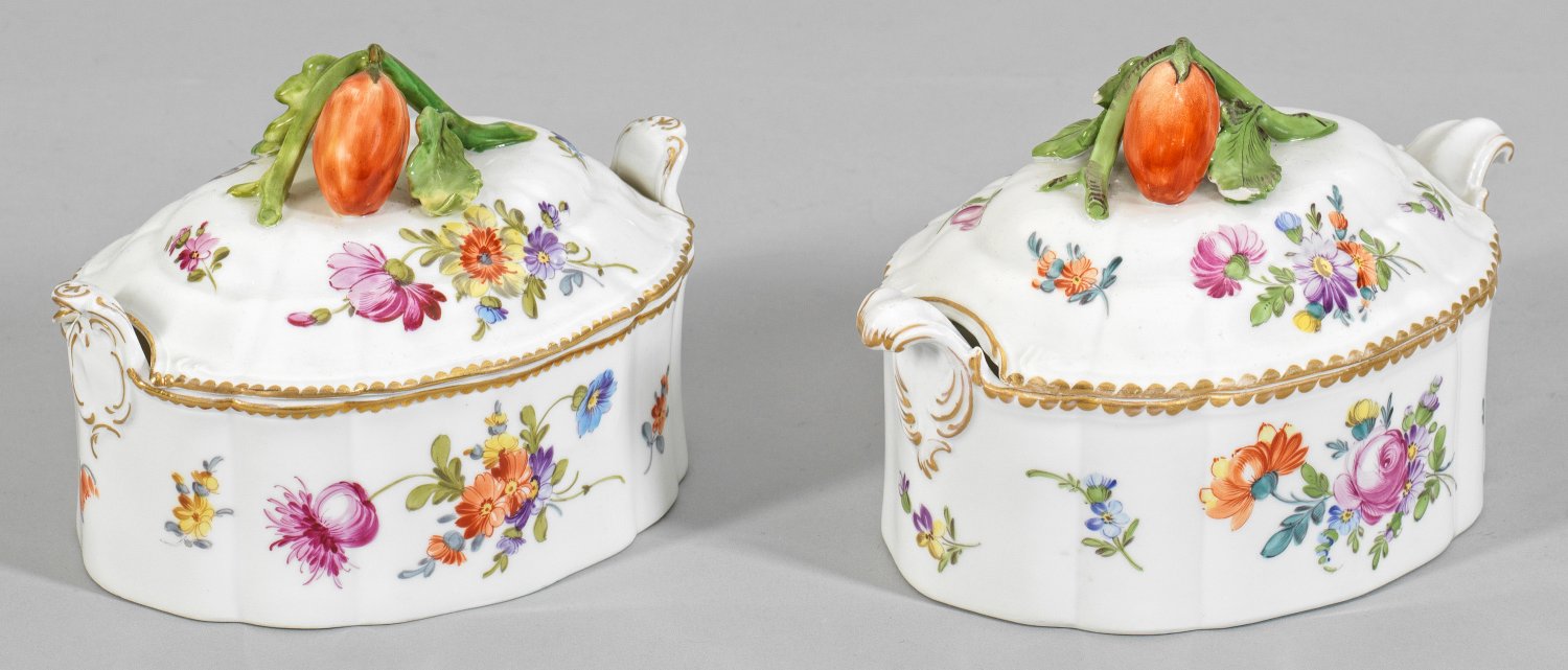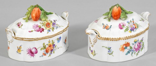 Paar kleine Terrinen mit Blumendekor Ovaler, passig eingezogener Korpus mit aufgewölbtem Deckel, mittig plastischer Fruchtknauf. Allseitig farbenfroher Dekor aus Blumengebinden und gestreuten Blüten in polychromer Malerei. Goldzahnkante. Minim. best.; Manufakturmarke. H. 11 cm. 16,5 cm x 11 cm.