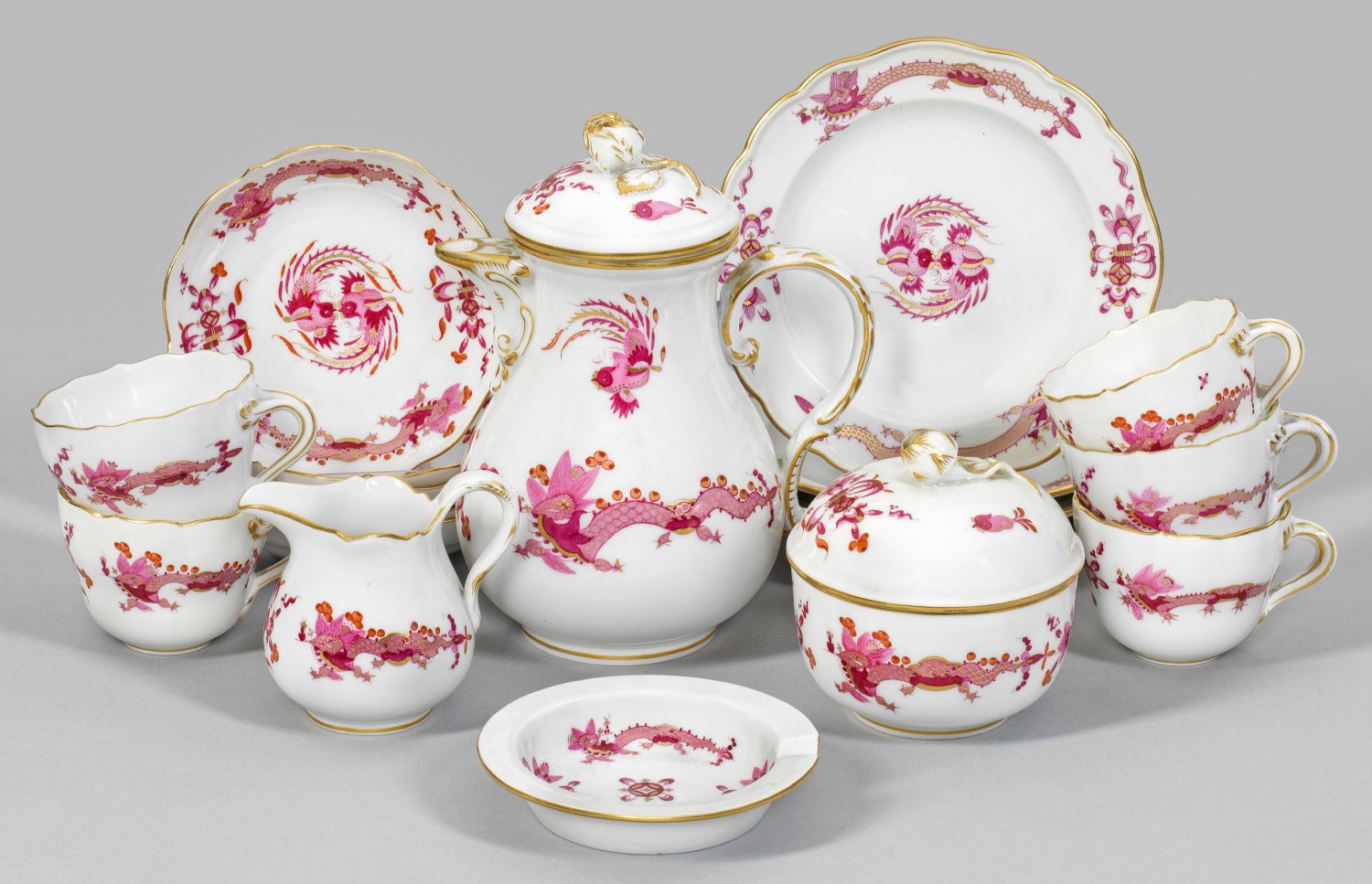Mokkaservice mit Dekor "Reicher Drache" 13-tlg.; Mokkakanne, Sahnegießer, Zuckerdose, 5 Tassen mit Untertassen, 4 Konfektteller, Aschenbecher. Dekor "Reicher Drache" in purpurfarbener Camaieumalerei, goldstaffiert und teilw. rotschattiert. Minim. besch.; Schwertermarke. Kannen-H. 16 cm.