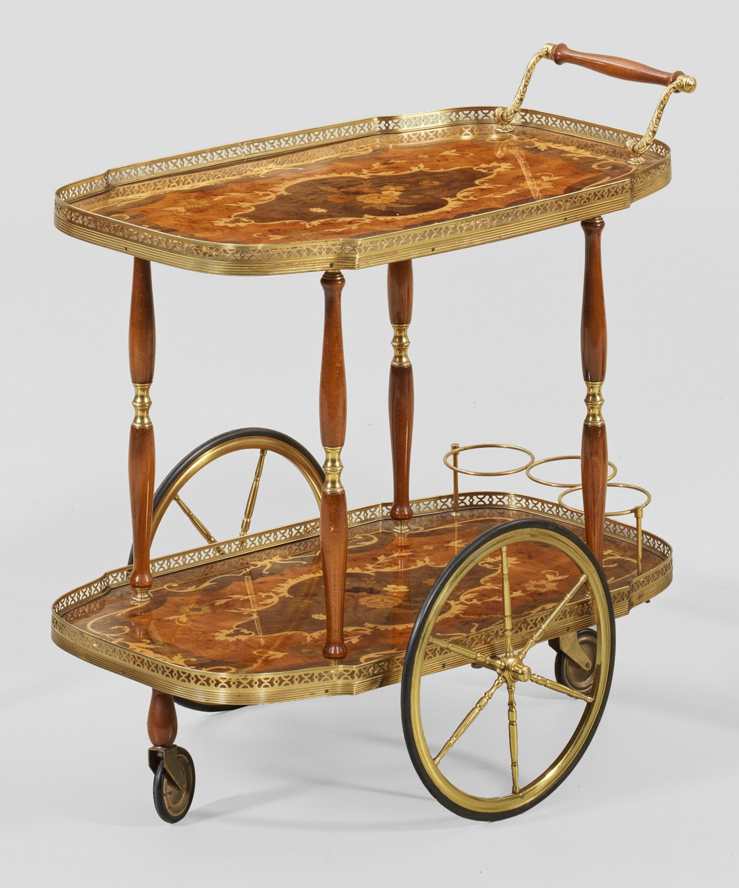 Dekorativer Barwagen Nussbaum und teilw. gefärbter Ahorn, furniert. Messing. Gegliederte Balustersäulen als Träger für bombierte, galeriegerahmte Abstellflächen auf Speichenrädern und kleinen Rollen. Flächendeckende Furnierfelder, begrenzt von Blüten und Blattranken. H. 75 cm. 78 cm x 44 cm.