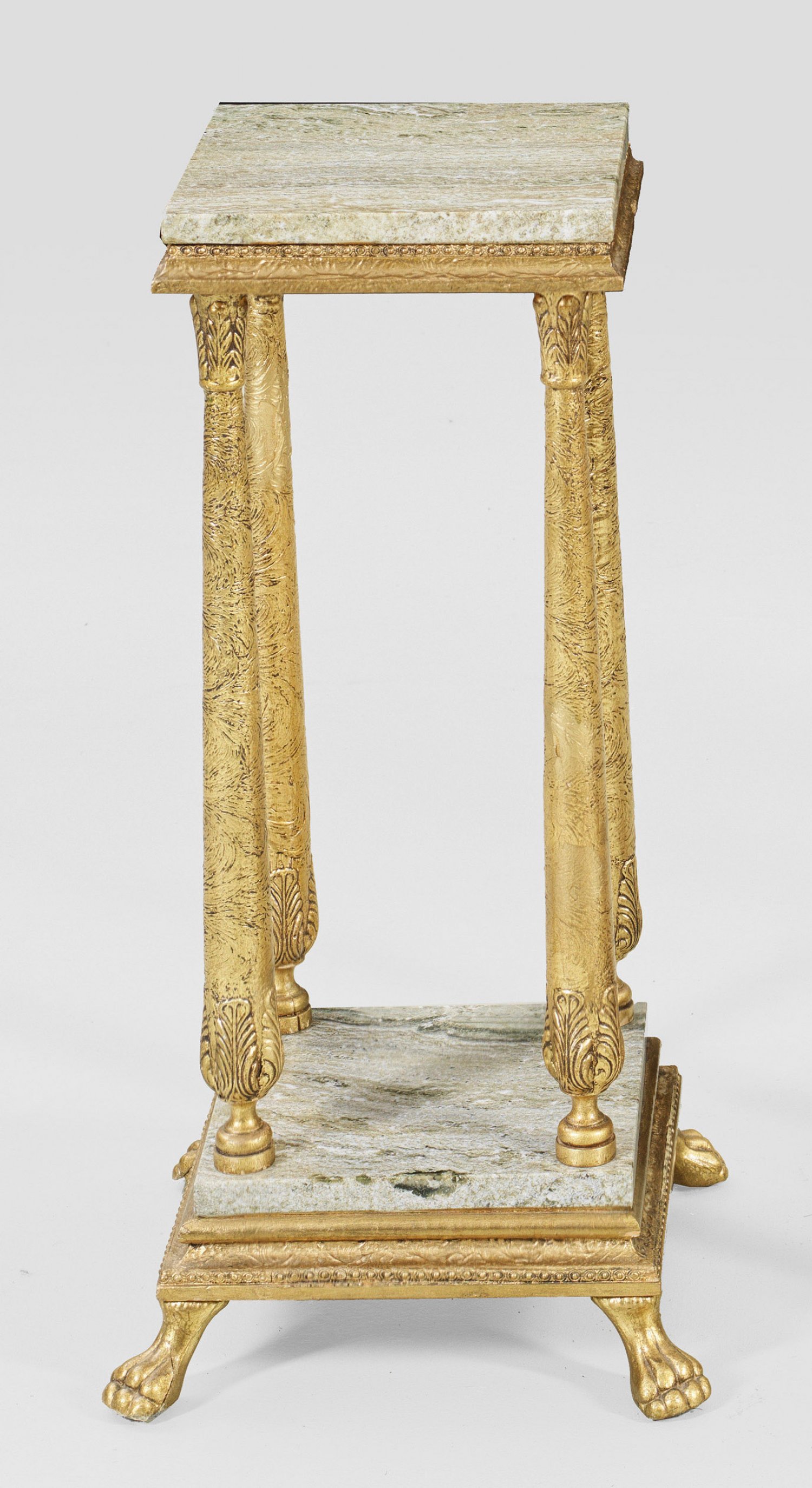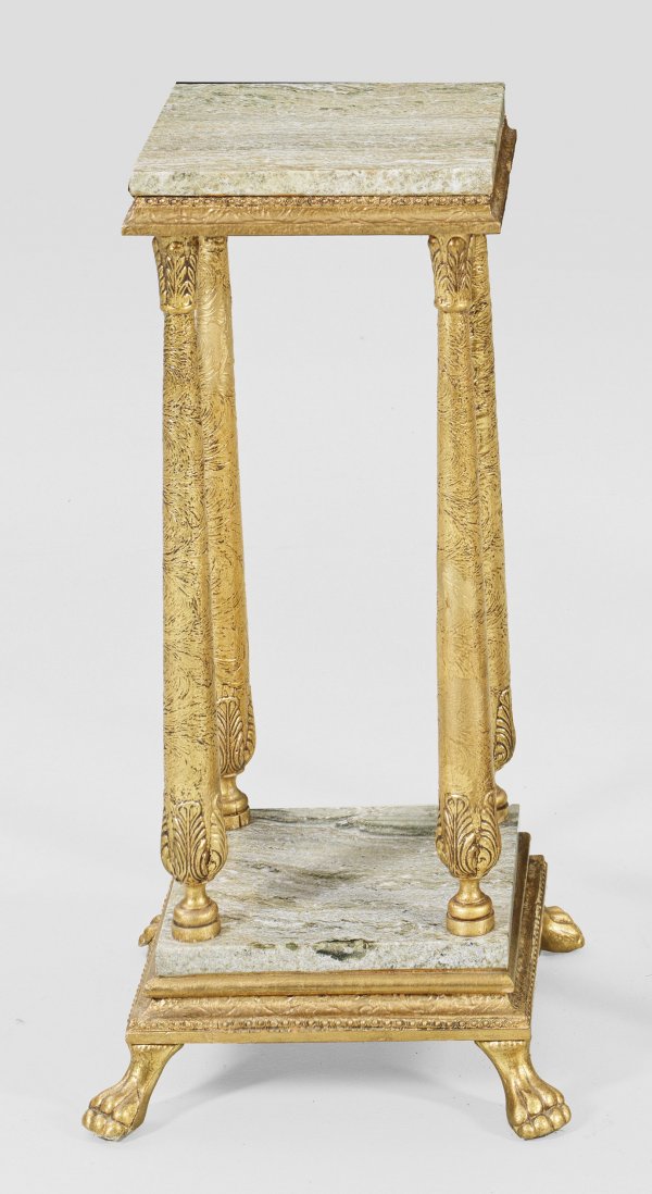 Gueridon im Louis XVI-Stil Holz, stuckiert, gefasst und vergoldet. Schmale Zarge auf konisch ansteigenden Balusterstäben sowie profilierter Sockelplatte mit Tatzenfüßen. Quadratische Deckplatte aus hellgrün gemasertem Marmor. H. 64,5 cm. 33 cm x 33 cm.