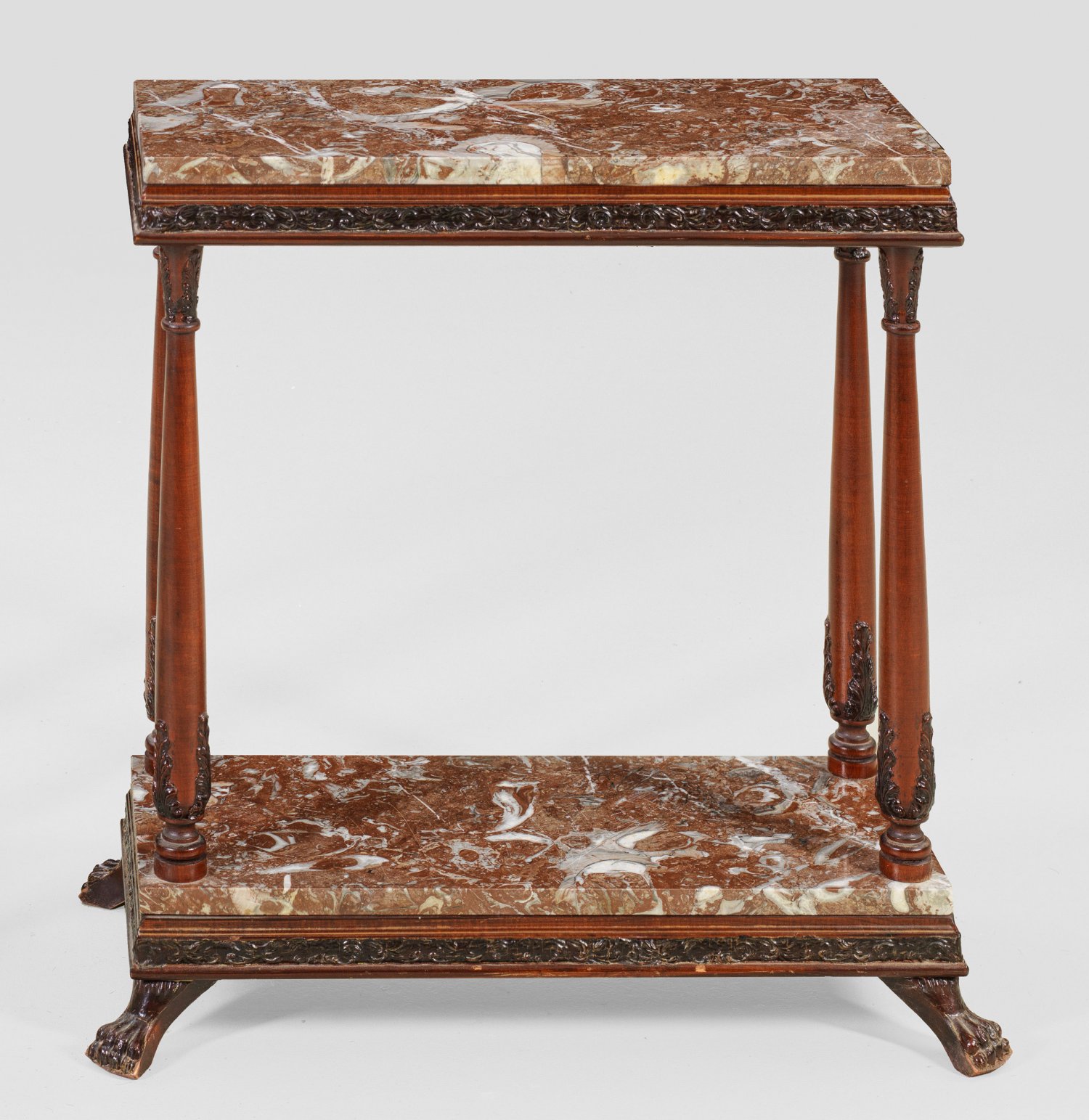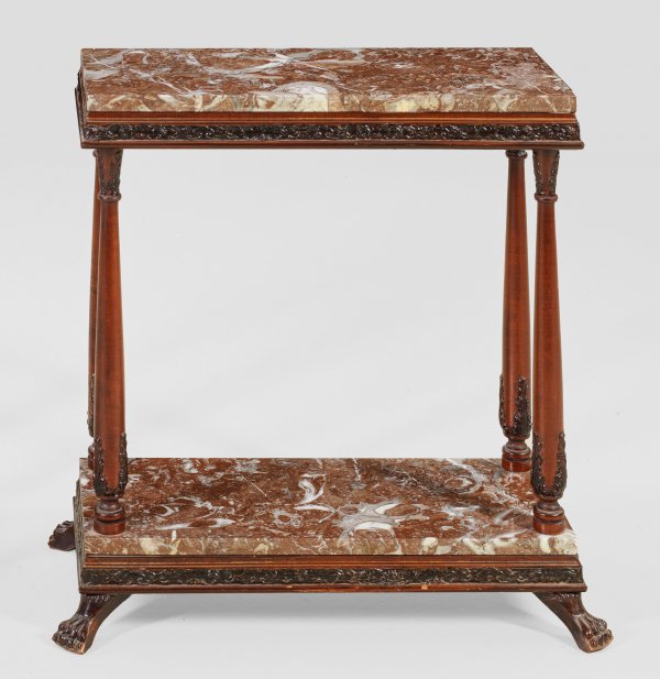 Kleine Konsole Holz, mahagonifarben gebeizt sowie rotbrauner, hellgrau und weiß gemaserter Marmor. Rechteckige, profilierte Zarge auf schlanken Balusterbeinen und korrespondierende Sockelplatte mit Tatzenfüßen. Rechteckige Deckplatte. H. 66,5 cm. 62 cm x 27 cm.