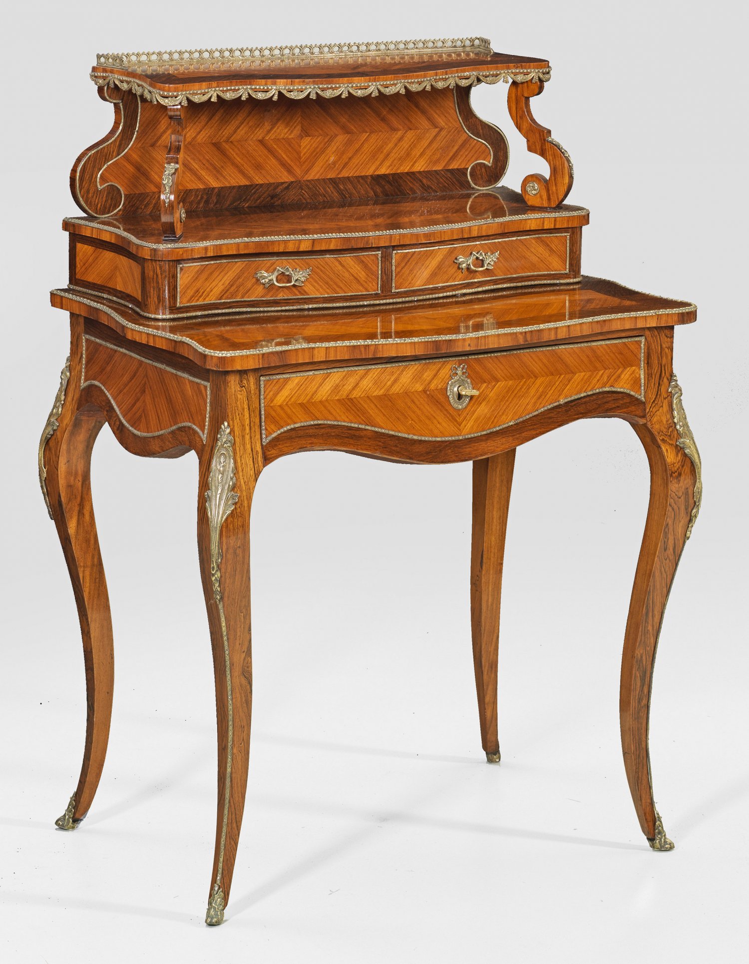 Napoleon III-Damenschreibtisch Palisander und Rosenholz, furniert. Passig geschweifter Zargenkasten mit ausziehbarer Arbeitsfläche auf hohen, stark geschwungenen Beinen. Profilgerahmte Deckplatte. Zurückgesetzter, zweischübiger Aufsatz mit etagerenähnlichem oberen Abschluss über schräggestellten Voluten. Schauseitig flächendeckende Furnierfelder sowie Applikationen aus Bronze. H. 104 cm. 71 cm x 50 cm.
