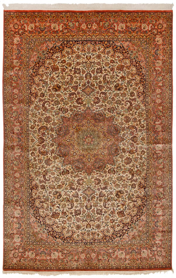 Kaschmir-Seidenbrücke Indien. Seide auf Seide. Sehr feine Knüpfung. Im elfenbeinfarbenen, ovalen Innenfeld großes rundes Zentralmedaillon sowie breite, passig geschweifte Ecklösungen. Flächendeckend dichte Blütenmusterung. Umlaufend hellrote Bordüre mit dichter Blütenmusterung. 280 cm x 185 cm.