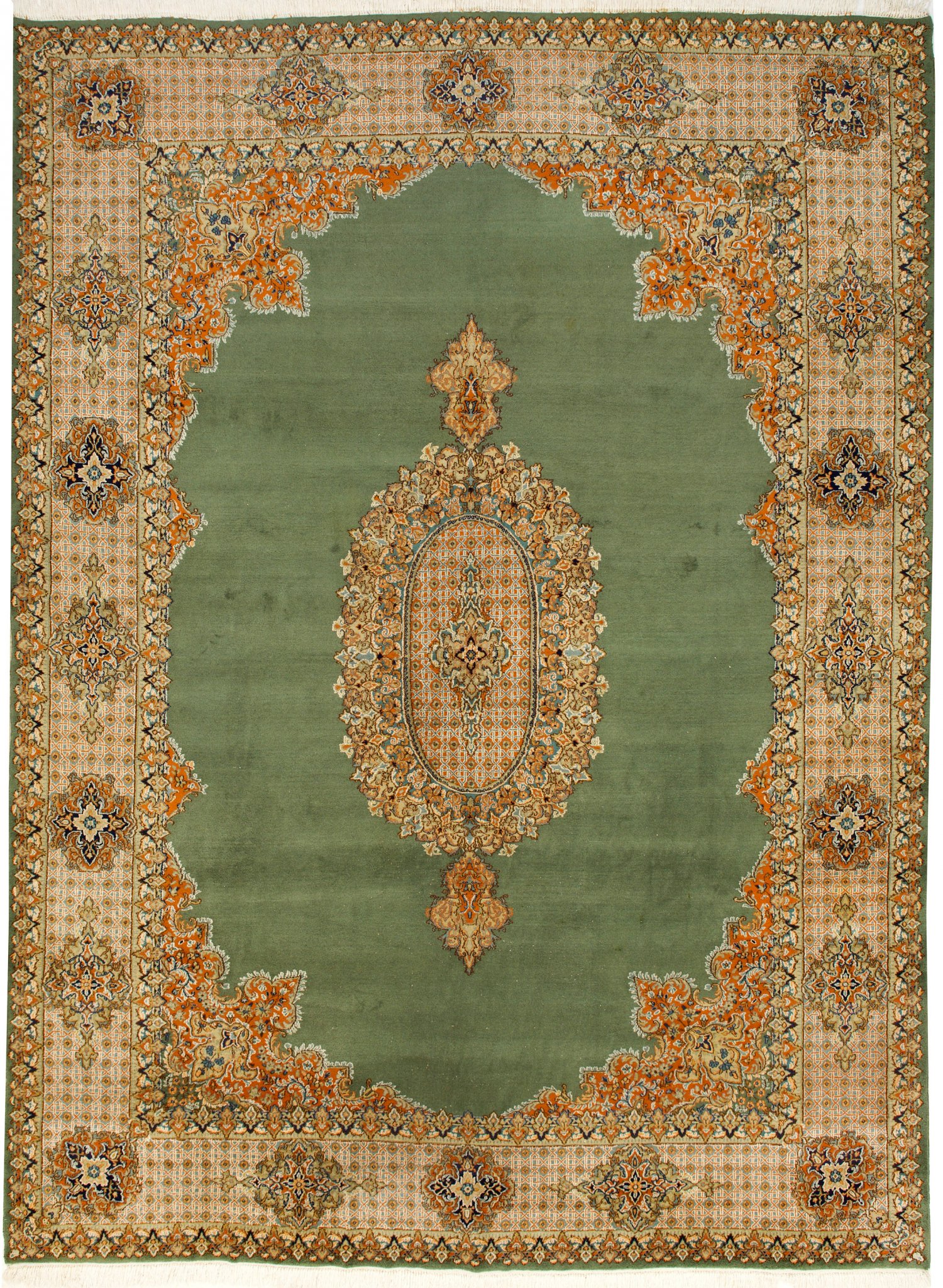 Großer Kirman-Teppich Persien. Wolle auf Baumwolle. Auf monochromem seegrünen Fond gestrecktes Ovalmedaillon aus gitterähnlich angeordneten Rosetten, umgeben von dichter Blütenrahmung mit Anhängern. Umlaufend breite Bordüre mit korrespondierender Musterung. 400 cm x 300 cm.