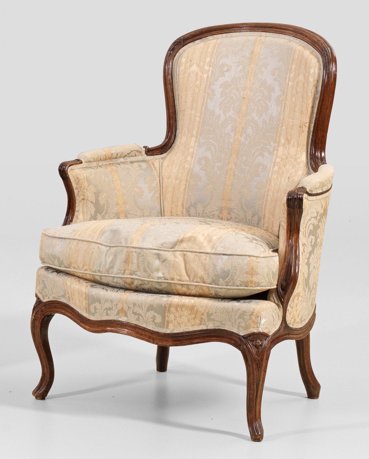 Louis XV-Bergère Nussbaum. Bombierte, passig geschweifte Zarge auf schlanken, blattreliefierten Volutenbeinen. Geschweift ansteigende Stützen in korrespondierende, schmale Armlehnen übergehend. Gewölbte Rückenlehnenrahmung. Allseitig gepolstert und bezogen. H. 97 cm. 70 cm x 65 cm. Sitz-H. 40 cm.