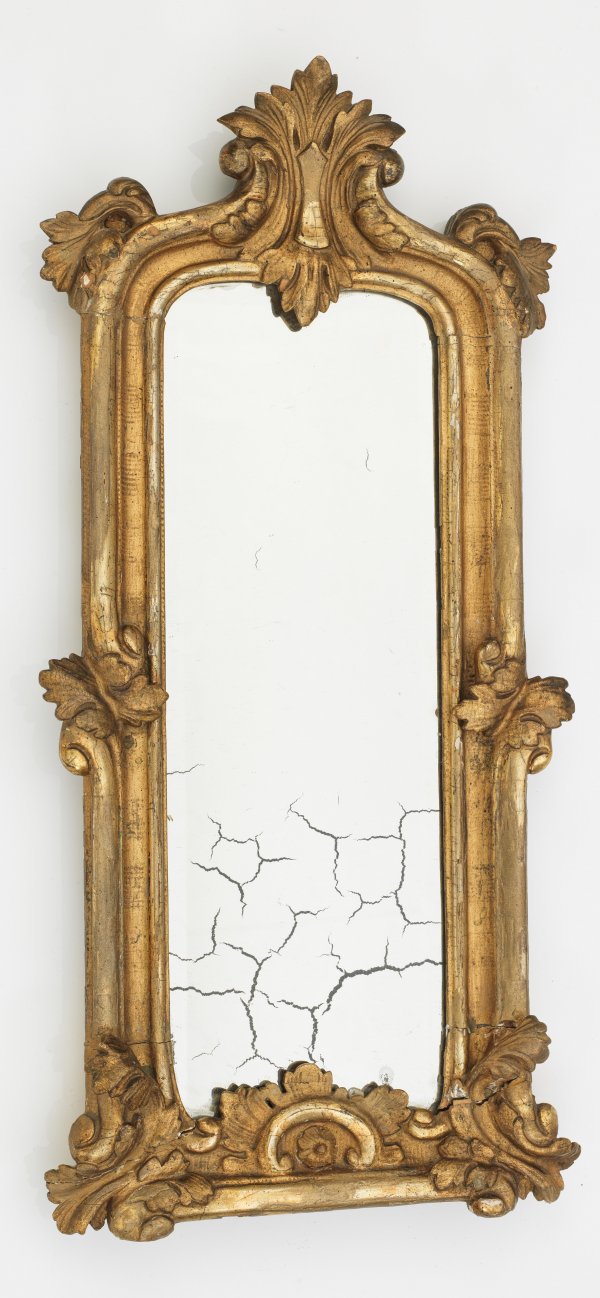 Kleiner Barock-Wandspiegel Holz, geschnitzt, gefasst und vergoldet. Schlanke, hochrechteckige, gekehlte und blattreliefierte Spiegelrahmung mit Bekrönung in Form einer großen Blattkartusche. Rückseitig Etikett Sammlung Heinz Weck. Altersspuren. 61 cm x 29 cm.