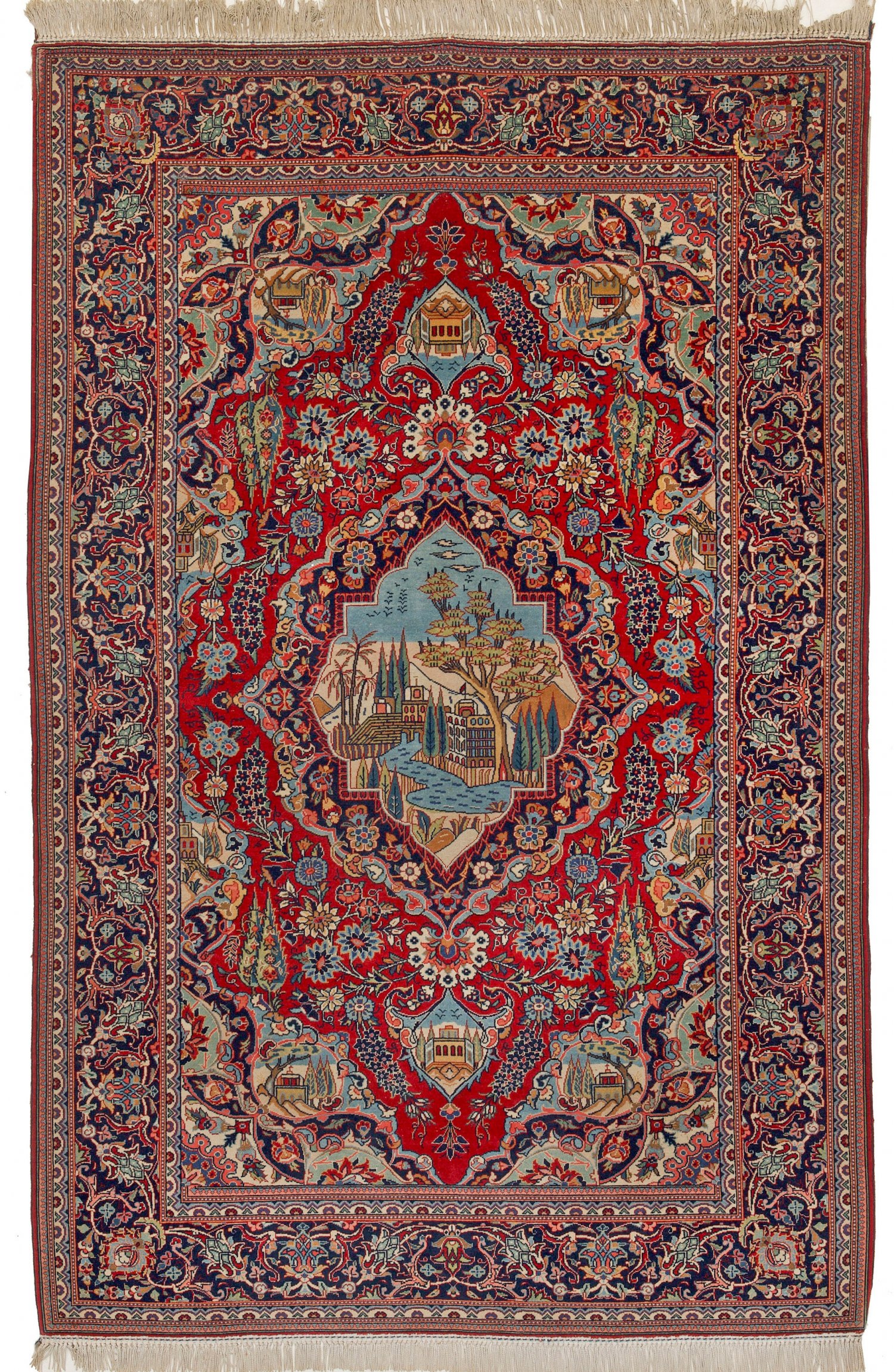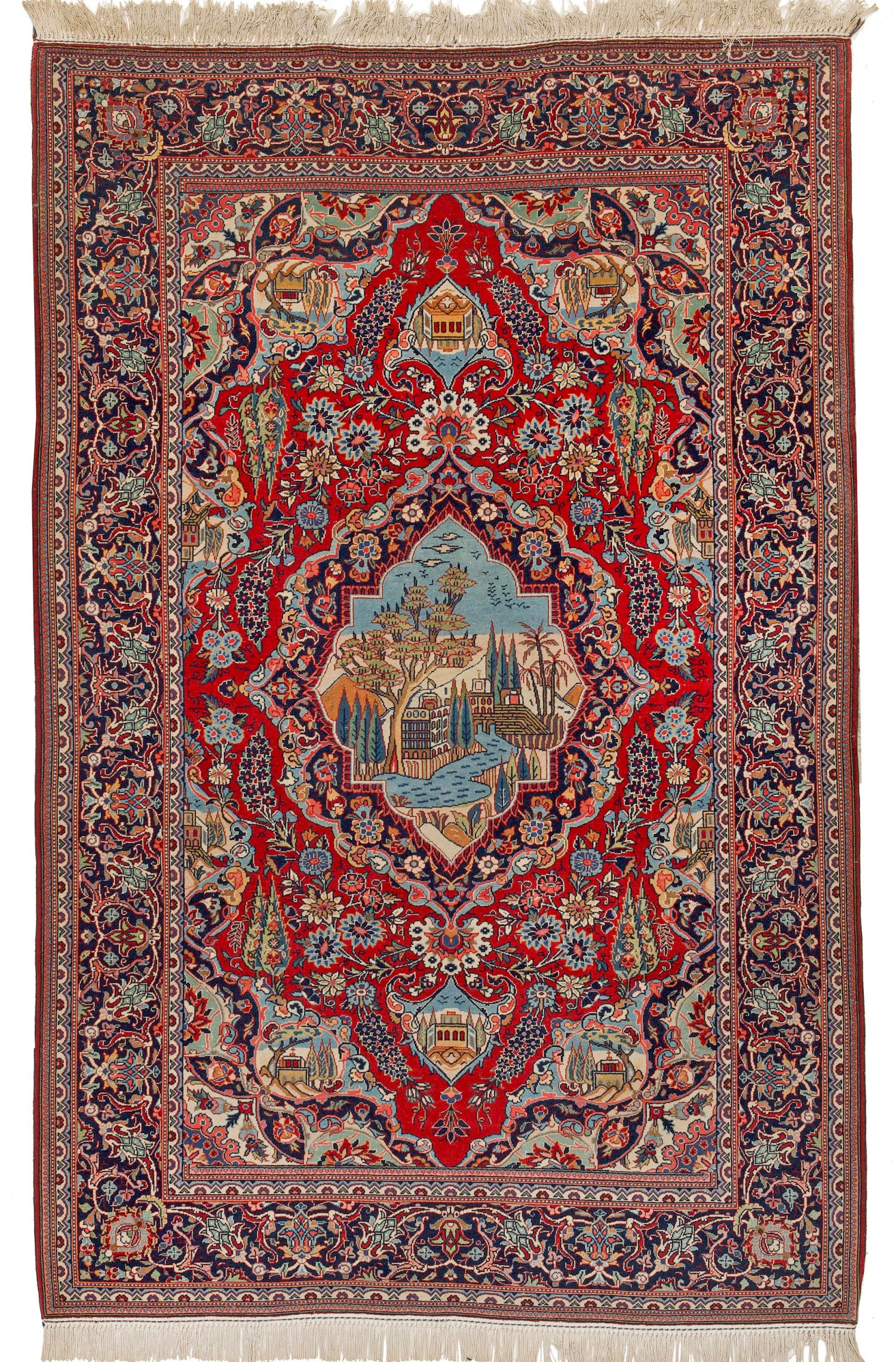 Seltenes Paar antike Keschan-Brücken Gegenstücke. Persien. 1. Hälfte 20. Jh.; Korkwolle auf Baumwolle. Auf hellrotem Fond große kartuschenförmige Zentralmedaillons mit gespiegelten Landschafts- und Architekturdarstellungen sowie korrespondierenden Anhängern. Breite, passig geschweifte Ecklösungen. Flächendeckende Musterung aus Lebensbäumen, Blütenrispen und Dolden. Umlaufend dunkelgrundige Bordüre aus üppigen Palmettenranken, flankiert von schmalen Nebenbordüren. 207 cm x 133 cm bzw. 202 cm x 135 cm.