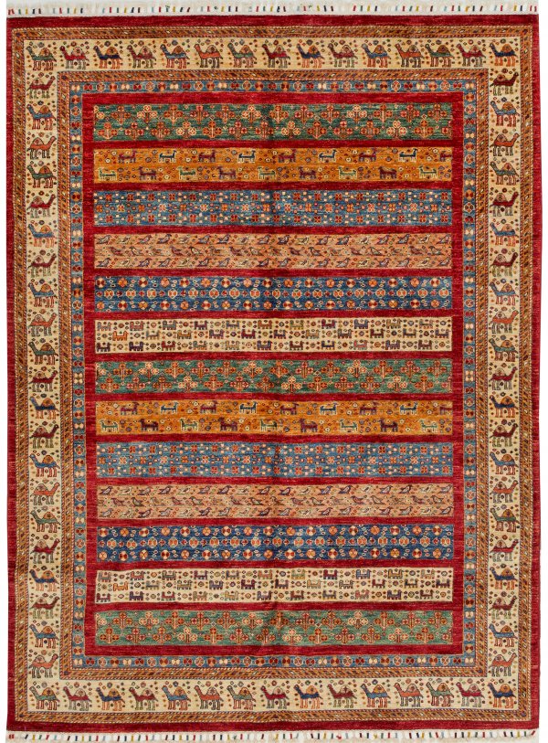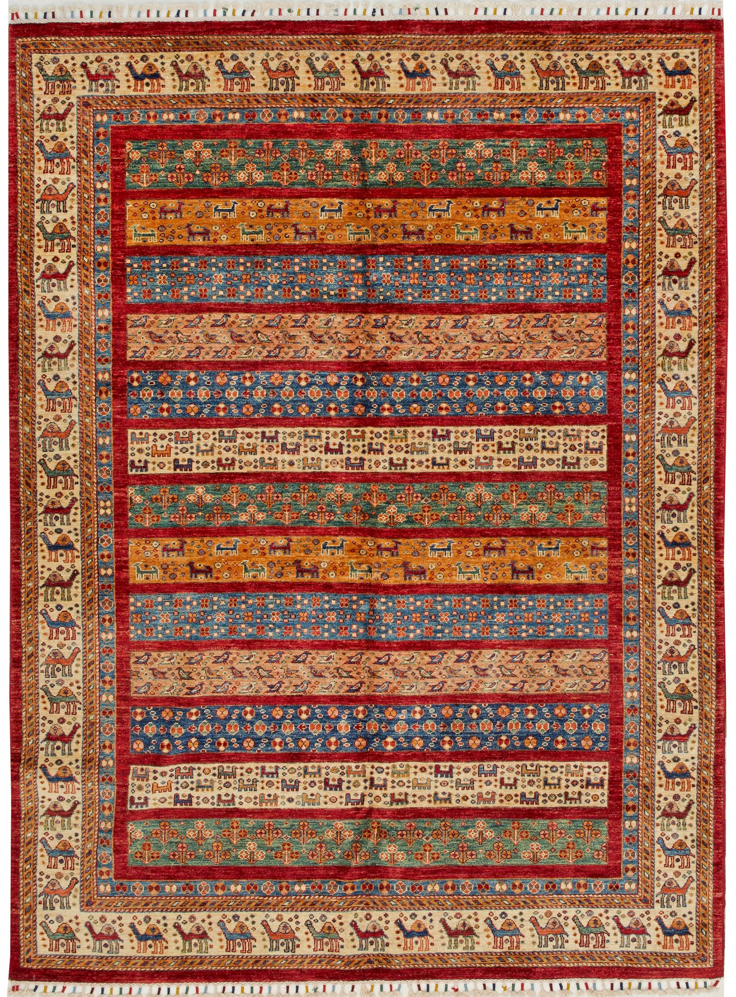Dekorativer Streifenteppich Wolle auf Wolle. Flächendeckende Streifenmusterung aus unterschiedlichen Friesen mit Tier- und Blütendarstellungen im Rapport, unterteilt durch schmale rote Streifen. Umlaufend beigefarbene Bordüre aus gereihten Kamelen. 243 cm x 180 cm.