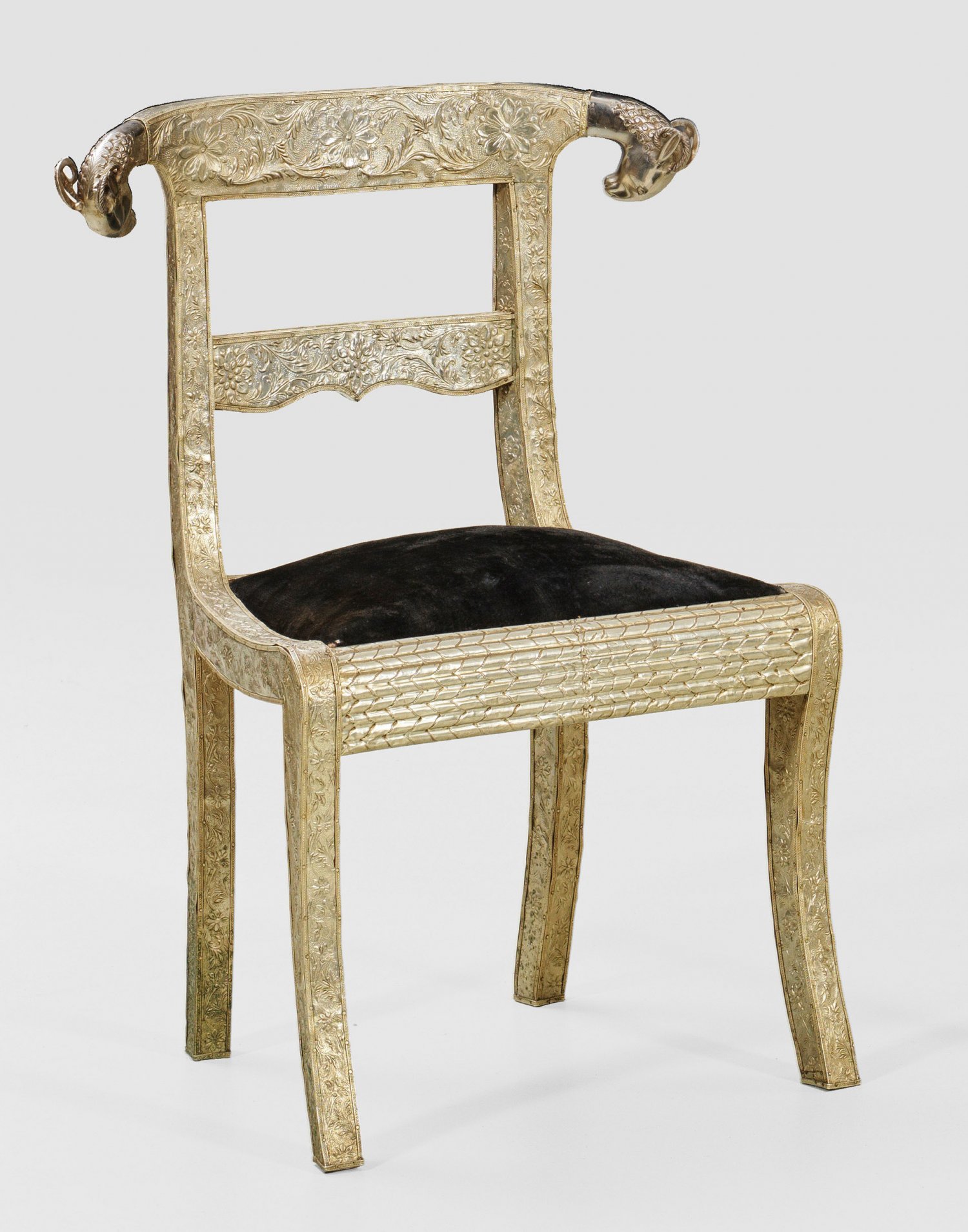 Widderkopfstuhl im Regency-Stil Holz, flächendeckend belegt mit dünn gewalztem, silberfarbenem Metallblech. Trapezförmige Zarge auf leicht gebogten Beinen. Stark gewölbte Rückenlehnenrahmung mit vollplastisch gestalteten Widderköpfen. Allseitig erhaben reliefierter Dekor aus üppigen Blütenranken. Sitzfläche gepolstert und bezogen. Sitz-H. 45 cm.