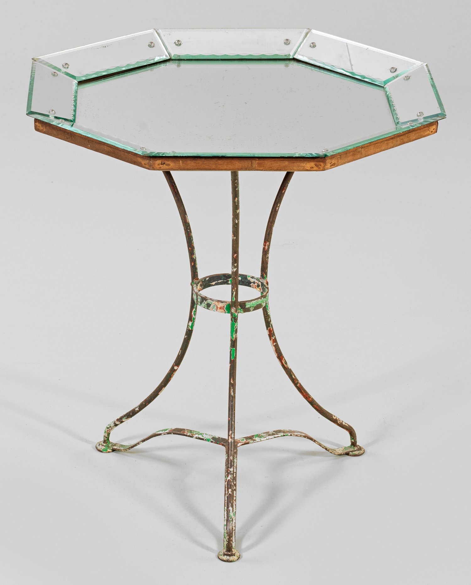 Tisch mit Spiegelplatte Schmiedeeisen mit Resten alter Lackierung sowie Holz und Spiegelglas. Offen gestaltetes Gestell aus gebogten Streben als Träger für oktogonalen Spiegel mit breiter, schräggesteller Rahmung aus facettierten Rauten. H. 78 cm. D. 76 cm.