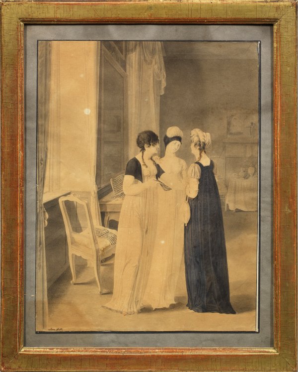 Interieurszene in der Empire-Zeit mit drei stehenden Damen bei einem Liederabend