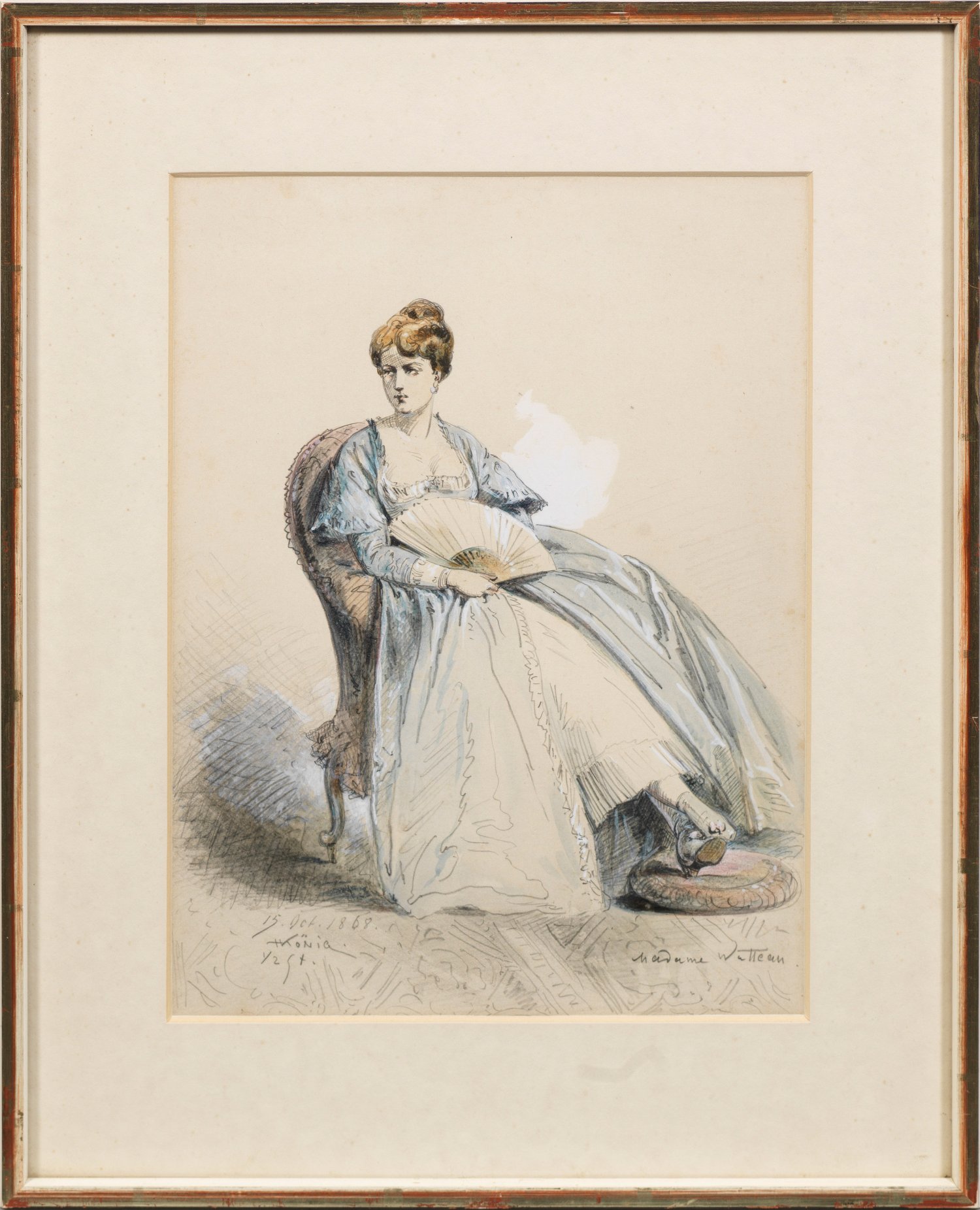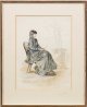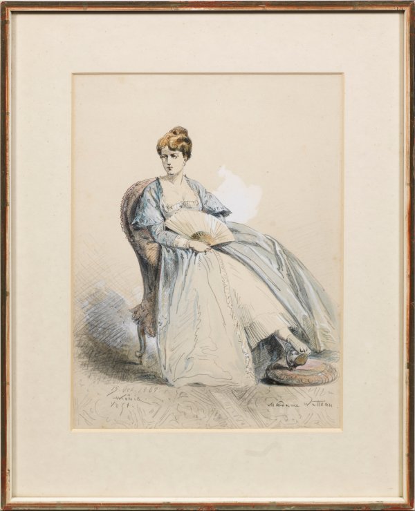Mit wenigen, wohlgesetzten Graphitstrichen präzise erfasste ganzfigurige Frauenporträts in der etwas übertriebenen Eleganz der französischen Kleidermode der 1860/70 Jahre. Königs bissige Karikaturen wurden u.a. im "Kladderradatsch" und in den "Fliegenden Blättern" veröffentlicht. Aquarell/Bleistift/Weißhöhung/Papier. Sign., Tagesdat. 1868 - 1875 und jeweils bez.; 30 cm x 22cm (Passepartoutausschnitt). Rahmen.