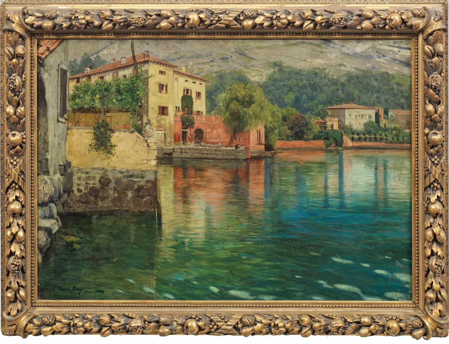 Sehr fein gemaltes naturalistisches Landschaftsgemälde mit Häusern am Gardasee, die sich auf der Wasseroberfläche reizvoll spiegeln. Öl/Lwd.; L. u. sign. verso sign., betitelt und datiert CLXX (1920); 64 cm x 90 cm. Prunkrahmen.