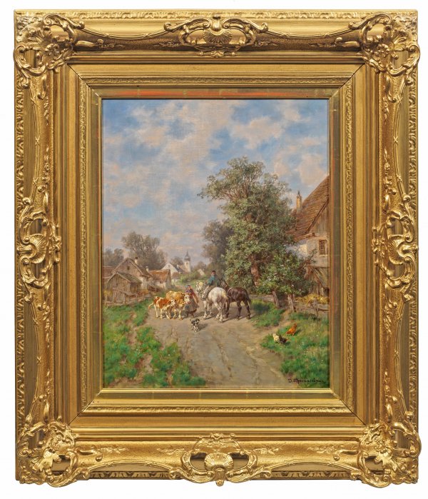 Mit lockerem Pinsel und duftigen Farben gemaltes Genrebild der Münchner Schule. Thomassin, der seine Motive in der ländlichen Umgebung Münchens fand, widmete sich in vielen seiner Bilder dem bäuerlichen Leben und Arbeiten, welches er stets als beschauliche Idylle darstellte. Öl/Lwd.; R. u. sign.; 50 cm x 40 cm. Rahmen.