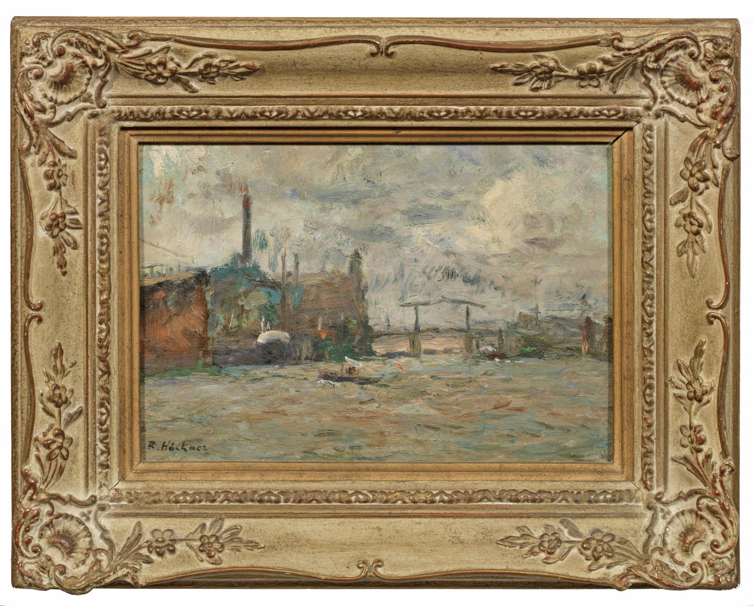 Mit flott und sicher gesetzten Pinselstrichen unter Freilichtbedingungen geschaffene Elbansicht aus dem Hamburger Hafen nahe dem Kaiserspeicher. Nach seinem Akademiestudium in Weimar bei Theodor Hagen, lebte Höckner seit 1905 in Hamburg und schuf oft kleinformatige Stadtansichten, die an Claude Monets London-Motive erinnern. Öl/Papier, auf Karton aufgezogen. L u. sign.; 14 cm x 20,5 cm. Rahmen.