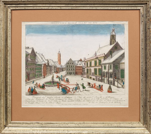 Guckkastenbild mit dem Markt im Winter in Göttingen Altkolorierter Kupferstich "Prospect deß großen Markt Allee in Göttingen (/) Nebst Rathaus (...)" von Balthasar Friedrich Leizelt gestochen, erschienen in der Kaiserlich Franziskischen Akademie, Augsburg, um 1786-1790. Unterhalb deutsch-französisch betitelt. Dargestellt ist der schneebedeckte Markt vor dem Rathaus mit Schlitten fahrenden Kindern und Erwachsenen. Plattenmaß ca. 31 cm x 37 cm (Passepartoutausschnitt). Rahmen.