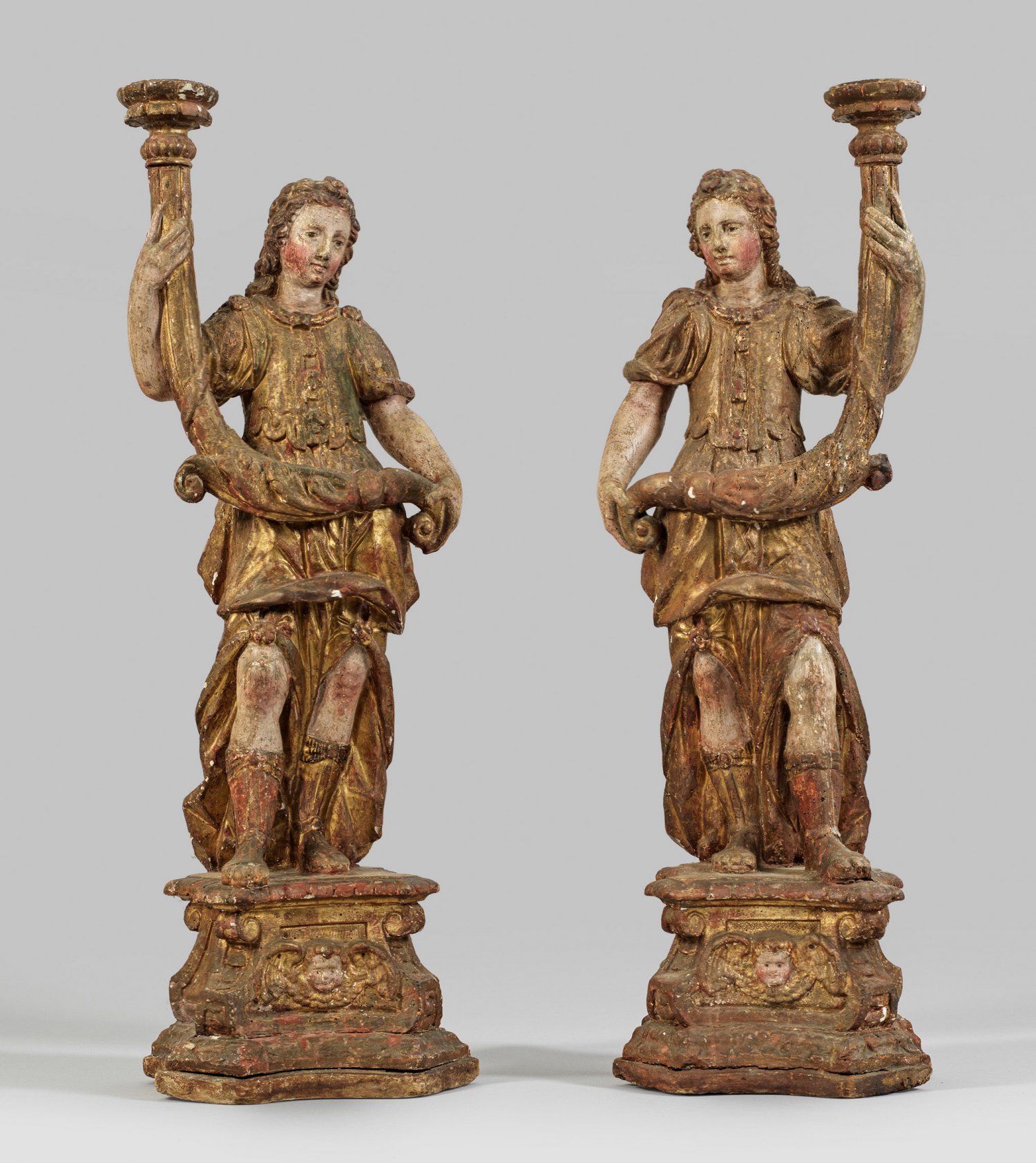 Gegenstücke. (Linden?)-Holz, geschnitzt, teilw. erhaltene alte bzw. originale farbige Fassung und Vergoldung. Vollplastisch gestaltete Darstellung zweier im Kontrapost stehender junger Männer in antikisierender, römischer Tracht, mit ihren beiden Händen jeweils einen füllhornartigen Leuchter tragend. Altersspuren. H. 91 cm.