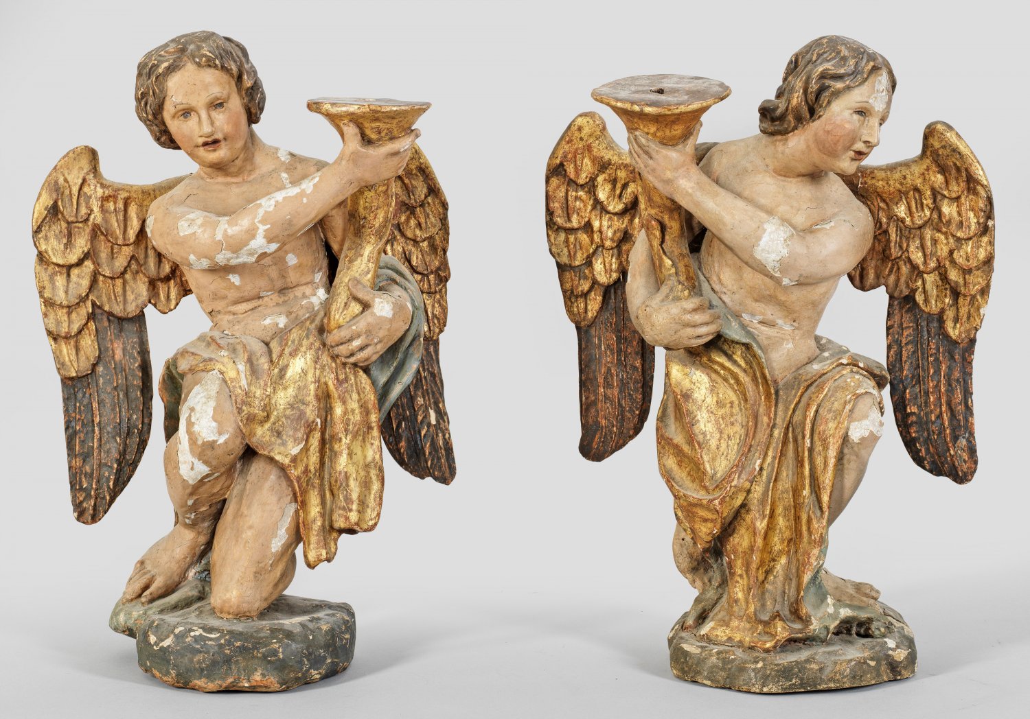 Gegenstücke. Lindenholz(?), geschnitzt; farbige Fassung und Vergoldung mit Altersspuren. Vollplastische Darstellung zwei kniender, jugendlicher Engel in der Tradition des Barock, jeweils einen füllhornartigen Leuchteram mit beiden Händen haltend. H. 47 cm.