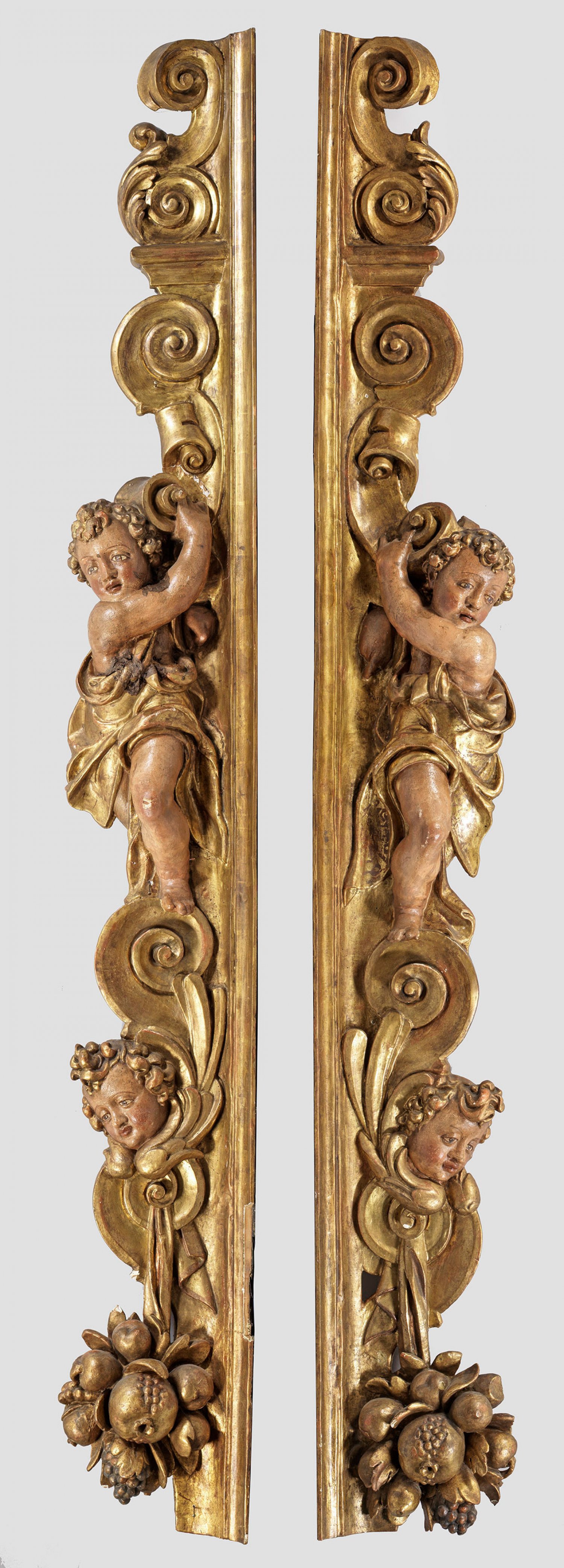 Paar große Barock-Pilaster Gegenstücke. Holz, geschnitzt, farbige Fassung und Vergoldung übergangen. Reliefplastisch geschnitzt mit jeweils einem Putto und Puttokopf zwischen Volutenspangen, unterhalb ein Früchtefeston mit Granatäpfeln. Rest. mit Erg.; H. 245 cm.
