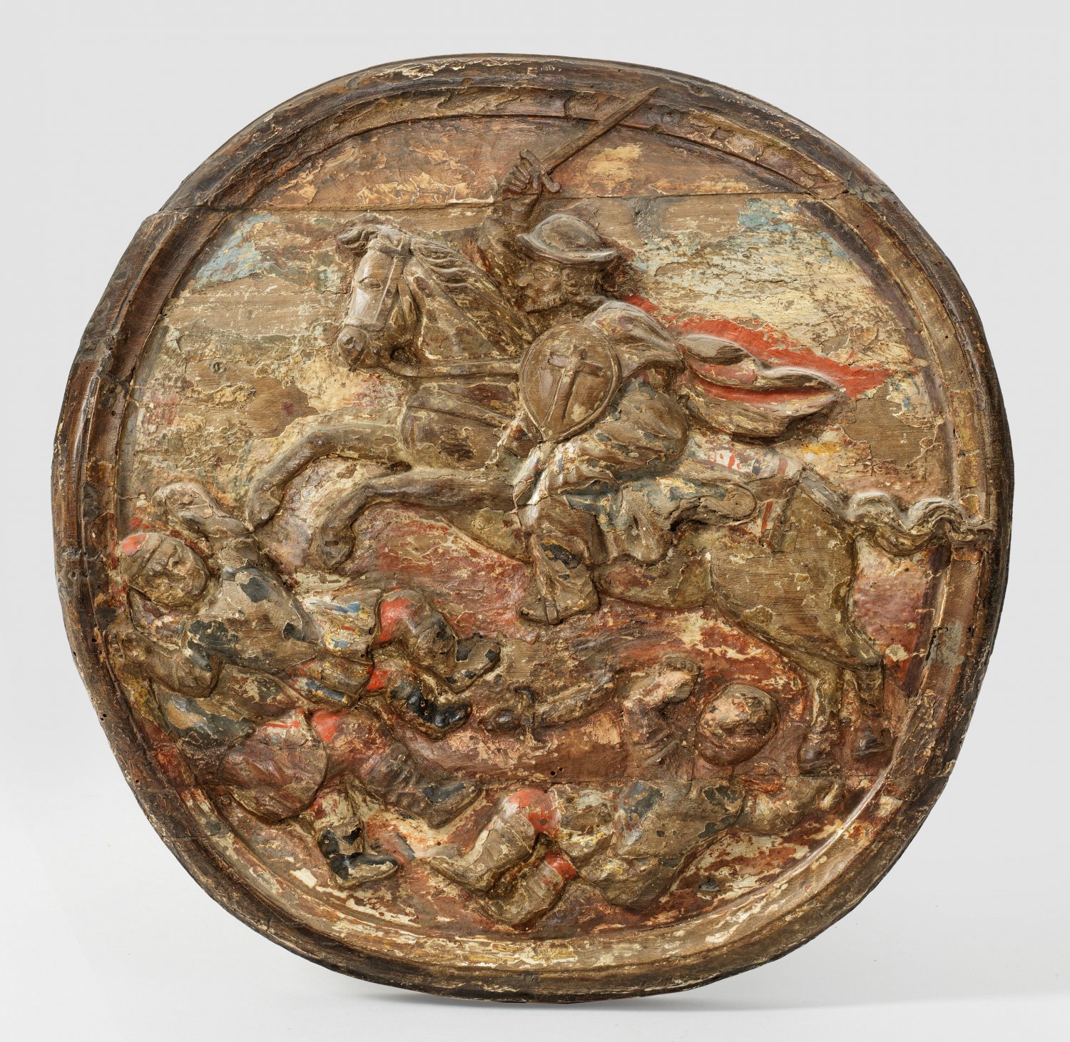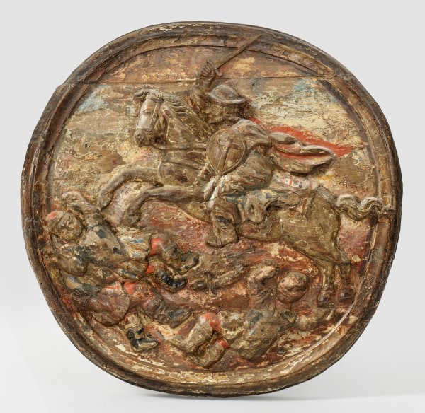 Lindenholz, geschnitzt, Reste alter Fassung und Vergoldung. Altersspuren. Szenische Darstellung einer Schlacht, bei der ein Reiter bzw. Ritterheiliger mit erhobenem Schwert auf seinem galoppierenden Pferd über die gefallenen Gegner hinweg springt. D. ca. 43 cm.