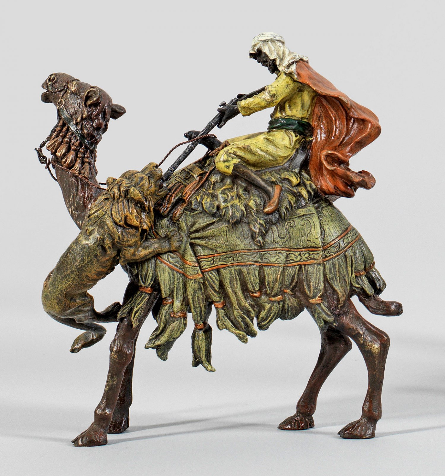 Auf einem Kamel reitender Araber im Kampf mit einem Löwen Bronze, dunkelbraun patiniert und poychrom bemalt. Vollplastische, detailreiche Darstellung in der Tradition der Wiener Araber-Bronzen der Fa. Bergmann. H. 17 cm.