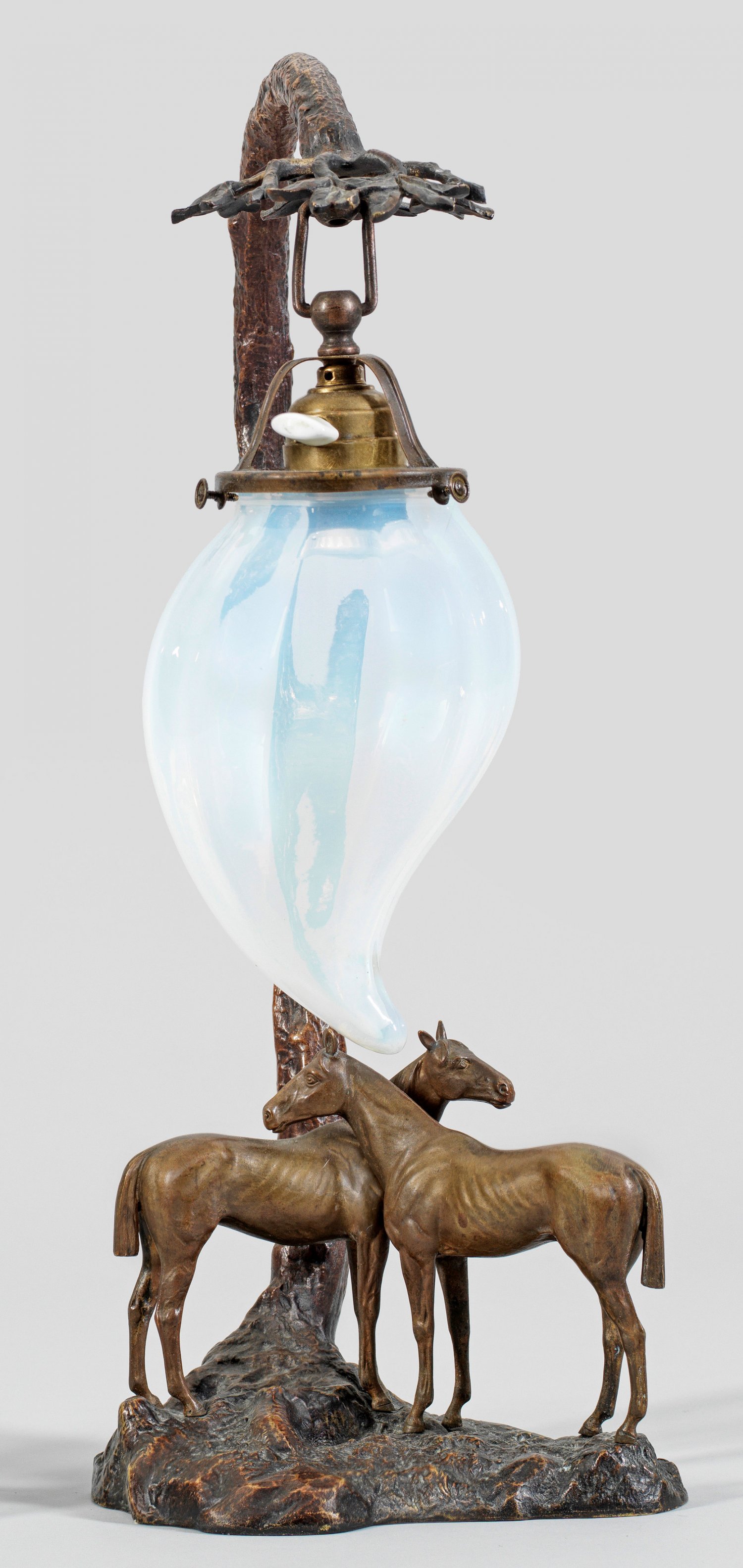 Figürliche Jugendstil-Tischlampe mit Pferdepaar 1-flg.; Bronze, in Brauntönen patiniert; längsoptisch geblasener Opalglaschirm; Messingfassung mit Porzellanschalter. Fuß mit zwei vollplastischen Pferden auf unregelmäßiger Plinthe, der Schaft als gebogter Baumstamm mit kleiner Blattkrone als Aufhängung für den flammenförmigen Schirm. Ohne Verkabelung. H. 50 cm.