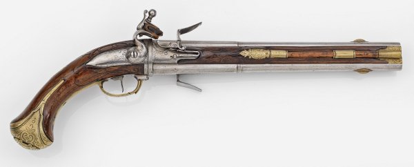 Barocke, doppelläufige Steinschloss-Wender-Pistole Nussbaumvollschäftung mit geschnitzten Rocaillen. Übereinander angeordnete, leicht konische Eisenläufe, die von achtkantig zu rund übergehen. Beide Läufe nummeriert, mit gravierter Signatur "Joseph Hauer in Bamberg". Batterie, Schlossplatte, Hahn und Abzug aus teilw. floral graviertem Eisen. Gegenplatte und Garnitur aus Messing mit Rocailledekor verziert. Beidseitige Darstellung einer Hatzjagd eines Hundes auf ein Reh. Seitlich angebrachter Ladestock aus Holz mit Messingdopper. L. 50 cm.